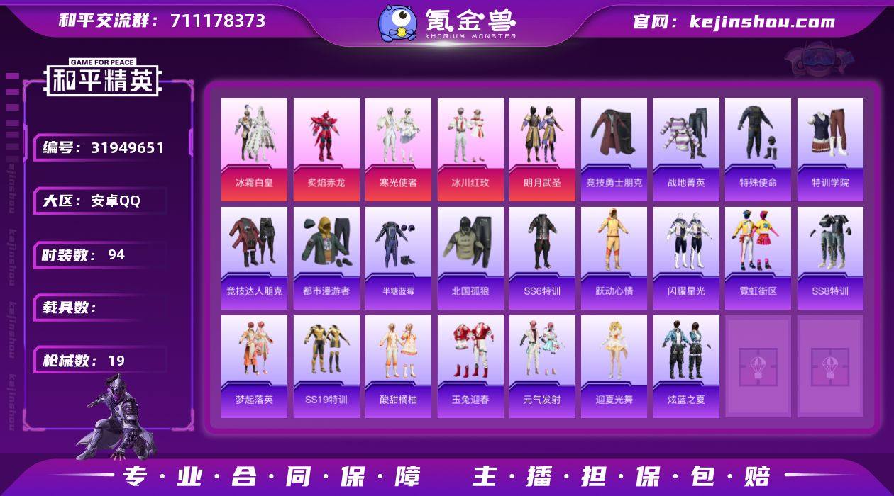 实名: 可修改 时装数: 94 枪械数: 19 热门装扮: 冰霜白皇,炙焰赤龙,寒光使者,朗月武圣,冰川红玫