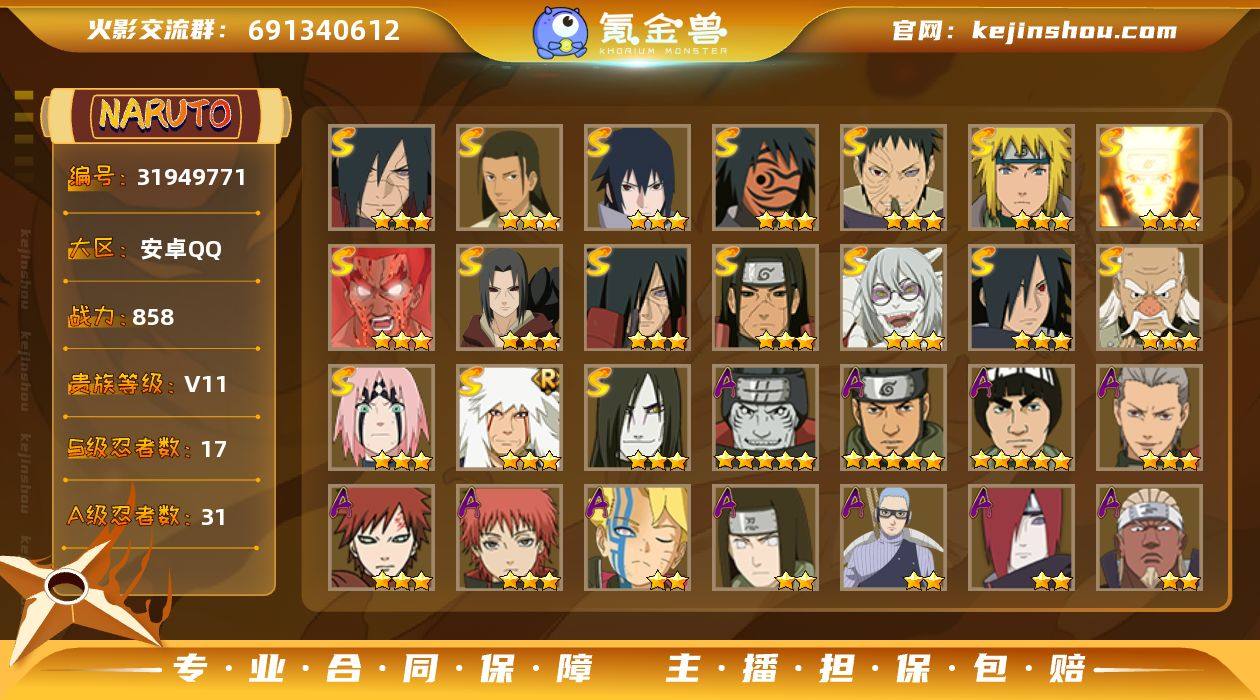 【编号37958 可秒换绑】【店长推荐精品号】16S级忍者数-35A级忍者数 【S级忍者】:千手柱间「秽土转生」(3星),宇智波鼬「秽土转生」(3星),宇智波斑「秽土转生·解」(3星),宇智波带土「忍界大战」(3星),艾「忍界大战」(3星),宇智波止水「须佐能乎」(3星),旗木卡卡西「须佐能乎」(3星),宇智波斑「木叶创立」(3星),艾「四代目雷影」(3星),自来也「舞之豪杰」(3星),大蛇丸(3星),波风水门(3星),神秘面具男「红夜之刃」(3星),漩涡鸣人「九喇嘛连结」(3星),佩恩「天道」(3星),宇智波佐助「永恒万花筒」(3星) 【A级忍者】:艾「青年」(2星),长门「青年」(2星),波风水门「青年」(2星),达鲁伊「博人传」(2星),迪达拉(2星),迪达拉「秽土转生」(2星),奇拉比「忍界大战」(2星),飞段(2星),飞段「死司凭血」(2星),干柿鬼鲛(5星),漩涡博人「桃式显现」(2星),漩涡鸣人「九尾查克拉」(2星),迈特凯(5星),旗木卡卡西「幻之真容」(2星),我爱罗「疾风传」(4星),蝎(3星),猿飞阿斯玛(4星),猿飞阿斯玛「秽土转生」(2星),宇智波止水「新春限定」(2星),宇智波鼬(2星),宇智波佐助「须佐能乎」(2星),宇智波佐助「万花筒写轮眼」(2星),照美冥「五代目水影」(2星),日向宁次「忍界大战」(2星),日向雏田「最终章」(2星),宇智波带土「暴怒」(2星),长十郎「六代目水影」(2星),神秘面具男「忍者之路」(2星),佩恩·六道「漂泊浪客」(2星),李洛克「忍界大战」(2星),黑土「博人传」(2星),勘九郎「忍界大战」(2星),秋道丁次「忍界大战」(2星),千代「近松十人卫」(2星),加藤断(2星)