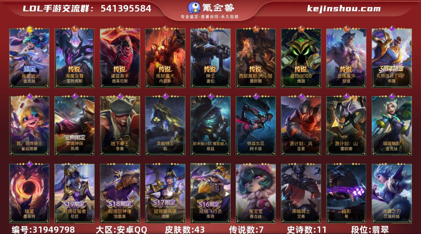 实名: 可修改 段位: 翡翠 皮肤数: 43 神话皮: 夜星流火 金克丝 传说皮: 灌篮高手,炼狱魔犬,神王盖伦,最终BOSS维迦,灵魂莲华腕豪,西部魔影大小姐蕾欧娜,海魔至尊 亚托克斯 亮点: 【优质装备】:灌篮高手,炼狱魔犬,神王盖伦,最终BOSS维迦,喵喵魅影金克丝,灵魂莲华腕豪