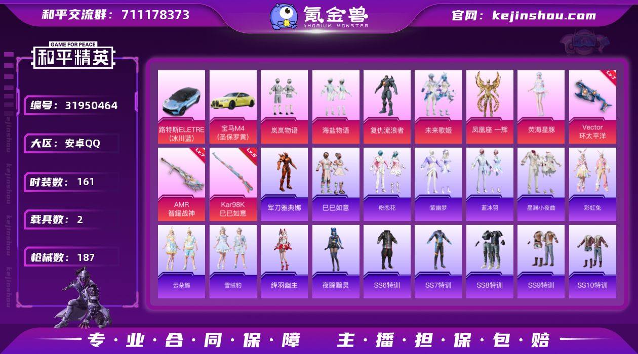 安卓 手Q-6粉装-5特效枪-2载具-0粉色飞行器-61176热力值-14王牌印记-161套装-187枪皮 【热门品类】:角色-军刀雅典娜 【粉色套装】:粉装-岚岚物语,粉装-海盐物语,角色-复仇流浪者,粉装-未来歌姬,角色-凤凰座 一辉,角色-荧海星豚 【粉色枪皮等级】:ACE32-萌骑漫游(五级),Vector-环太平洋(七级),Kar98K-巳巳如意(五级),Mk14-福马献瑞(四级),AMR-智耀战神(七级) 【粉色载具】:路特斯ELETRE(冰川蓝),宝马M4(圣保罗黄) 【粉色枪皮】:ACE32-萌骑漫游,Vector-环太平洋,Kar98K-巳巳如意,Mk14-福马献瑞,AMR-智耀战神 【粉色降落伞】:青春物语降落伞,环太平洋降落伞,垂柳戏鸭降落伞,旋转彩虹降落伞,智耀战神降落伞,星穹咏叹调降落伞,绯穹魔姬降落伞,异瞳寒姬降落伞 【稀有套装】:套装-巳巳如意,套装-马上有钱,套装-粉恋花,套装-紫幽梦,套装-蓝冰羽,套装-星渊小夜曲,套装-彩虹兔,套装-云朵鹅,套装-雪绒豹,角色-绛羽幽主,角色-夜瞳黯灵,套装-雨过天青,套装-红釉青花 【稀有枪皮】:AKM-夜灯,AKM-彩虹符号,AKM-影袭,AKM-星之彼岸,AKM-环太平洋,AKM-生命誓言,AKM-破晓战魂,AKM-萌趣颜团子,AKM-虎虎生威,AKM-霓虹街区,AKM-龙的传人,M16A4-夜灯,M16A4-幻世战舞者,M16A4-甜心亚梦,M16A4-红色方程式,M16A4-蓝色火焰,SCAR-L-炫彩节奏,SCAR-L-玉兔迎春,SCAR-L-红色方程式,M416-夜灯,M416-糯团青竹,M416-红色方程式,M416-绯红前夜,M416-蓝色火焰,GROZA-彩虹符号,AUG-耀粉歌者,QBZ-原初圣火,QBZ-妙趣可丽,QBZ-彩虹符号,M762-天降萌叽,M762-牛气冲天,M762-第五大道,M762-绯红前夜,M762-镭射皇者,M762-云朵鹅,Mk47-妙红点点,G36C-星穹咏叹调,AC-VAL-天降萌叽,AC-VAL-甜心亚梦,蜜獾-垂柳戏鸭,蜜獾-天降萌叽,蜜獾-娇憨猪猪,蜜獾-绯穹魔姬,UZI-娇憨猪...