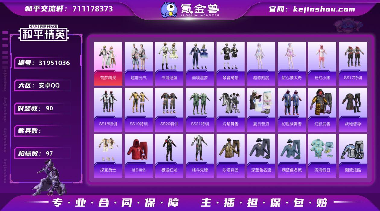 安卓 手Q-2粉装-3特效枪-0载具-1粉色飞行器-27613热力值-6王牌印记-90套装-97枪皮 【热门品类】:套装-粉红小猪 【粉色套装】:粉装-筑梦精灵,角色-虎痴许褚 【粉色枪皮等级】:ACE32-萌骑漫游(四级),AKS-74U-森灵之息(五级),Mk14-福马献瑞(五级) 【粉色枪皮】:ACE32-萌骑漫游,AKS-74U-森灵之息,Mk14-福马献瑞 【粉色飞行器】:星之彼岸飞行器 【粉色降落伞】:绝对恒星降落伞,星之彼岸降落伞,暗夜玫瑰降落伞,蓝莓炮弹降落伞,炫彩糖果降落伞 【稀有套装】:套装-超能元气,角色-超感刻度,角色-甜心蒙太奇,套装-雪国风尚,套装-马上有钱,套装-书海巡游,套装-画境星梦,套装-琴音绮想,套装-雨过天青,套装-红釉青花 【稀有枪皮】:AUG-冰晶雪宝,AKM-彩虹符号,AKM-灼热熔岩,AKM-王牌投手,AKM-破晓战魂,AKM-虎虎生威,AKM-霓虹街区,AKM-龙的传人,M16A4-幻世战舞者,M16A4-甜心亚梦,M16A4-蓝色火焰,SCAR-L-夜灯,SCAR-L-玉兔迎春,SCAR-L-红色方程式,M416-夜灯,M416-红色方程式,M416-蓝色火焰,GROZA-彩虹符号,AUG-幻影战神,AUG-甜蜜菠萝,AUG-耀粉歌者,AUG-绝对恒星,M762-彩虹甜喵,Mk47-洛神天依,AC-VAL-天降萌叽,AC-VAL-甜心亚梦,蜜獾-娇憨猪猪,ACE32-画境星梦,UZI-娇憨猪猪,UZI-炫彩节奏,UZI-红色方程式,UMP45-夜灯,UMP45-生命誓言,UMP45-蓝色火焰,Vector-生命誓言,汤姆逊-天降萌叽,汤姆逊-炫彩节奏,汤姆逊-耀粉歌者,MP5K-画境星梦,P90-筑梦精灵,Kar98K-炫彩节奏,Kar98K-王子的夏天,M24-影袭,M24-炫彩节奏,SKS-炫彩节奏,VSS-星之彼岸,Mini14-耀粉歌者,Mk14-暗星紫秘,SLR-娇憨猪猪,M1加兰德-画境星梦,S686-橘柚倾心,S686-生命誓言,S1897-炫彩节奏,S12K-破晓战魂,S12K-娇憨猪猪,S12K-幻世战舞者,DBS-甜心亚梦,AA12-G-画境星梦,M249-破晓战魂,DP-...