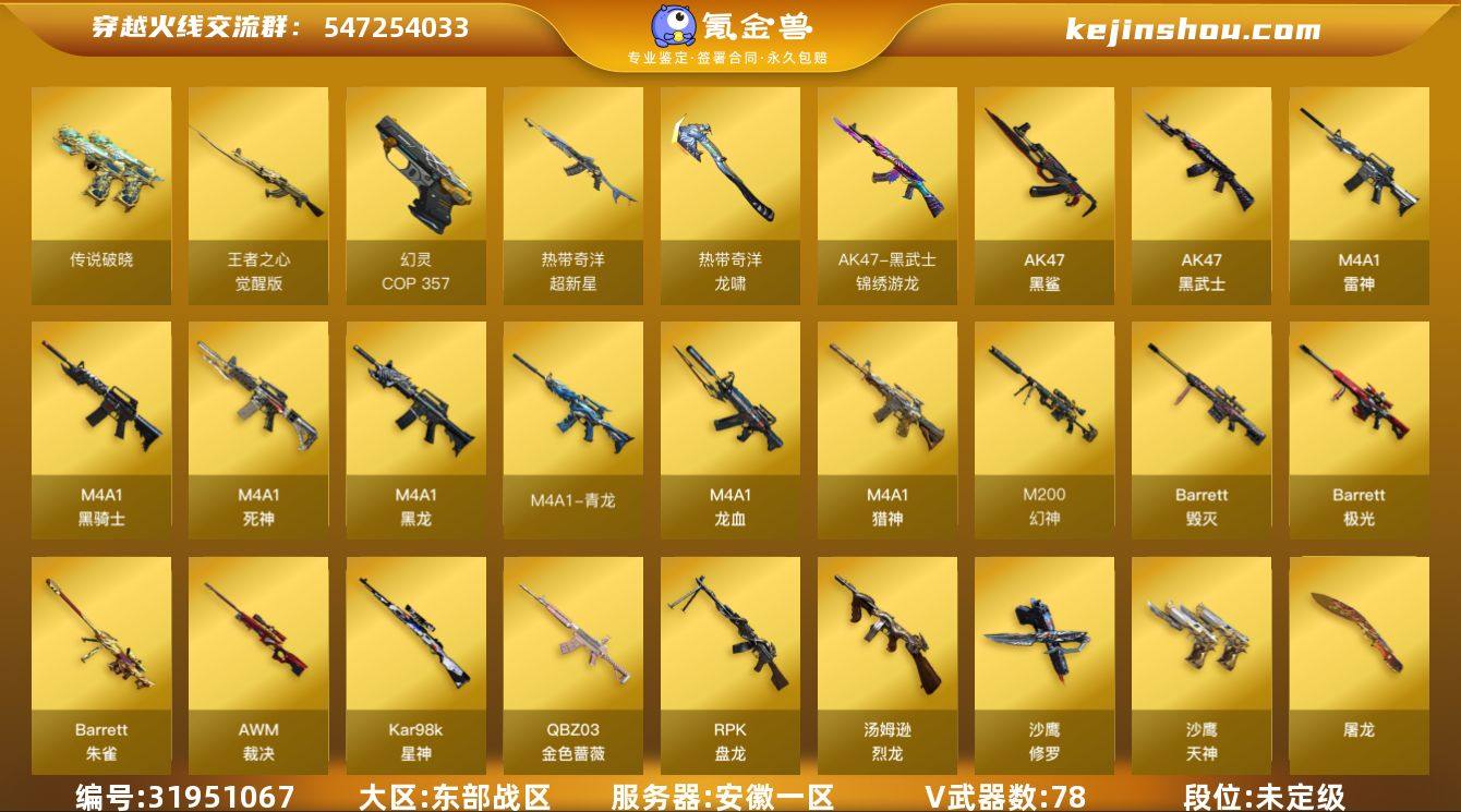 安徽一区-82V-9王者-0炫金 【传说武器】:传说破晓 【热门武器】:传说破晓,QBZ03-金色蔷薇,M4A1-青龙,M200-幻神,Kar98K-星神,M4A1-黑骑士*6,汤姆逊-烈龙*6,RPK-盘龙*5,加特林-炼狱*3,斯泰尔-蝴蝶,羊驼玩偶,雷神-小红,USP-雷暴,COP 357-幻灵,沙鹰-修罗,炽芒蝶刃 【王者炫金武器】:王者之魄高爆手雷,王者之魄闪光弹*4 【音效卡】:QBZ03-金色蔷薇-热带奇洋音效卡,M4A1-黑骑士音效卡,Barrett-毁灭音效卡,Barrett-极光音效卡 【皮肤】:星神-枪娘默 皮肤,雷神-星空,雷神-机甲刑天皮肤,雷神-航星皮肤,火麒麟-雷神*2,毁灭耀金皮肤,黑龙-能量核心,战神-粉色甜心皮肤,战神-流金岁月皮肤,AK47-B-常胜将军-曹操,AK47-B-常胜将军-刘备*2,AK47-B-常胜将军-孙权*2,极光-高能霹雳 皮肤,加特林-炼狱-钟馗皮肤,炼狱-末日审判 皮肤,修罗耀金皮肤 【角色】:电竞教官-云悠悠,关小雨,隼,王者春,王者影豹,奇洋探员,云海玲珑,暗夜-X,初恋灵狐,飞虎队-X,风暴女,嘉年华灵狐,娟娟,灵狐者-X,灵狐者-七夕宝贝,灵狐者-职业经理,龙儿-小淘气,曼陀罗-X,潘多拉-甜心教官,铁骑荣耀,兔囡囡,五号兵器-赛博朋克,樱-战斗天使,游珑儿 【人偶武器】:雷神-小红,天龙-曼陀罗,斯泰尔-蝴蝶,斯泰尔-枪娘暗刃,AWM-灵狐-15周年嘉年华,COP-旗袍,迷你深渊冰龙,迷你波特博士,迷你曼提柯尔,夺魂,迷你火种,迷你生化手雷*5,生化手雷-机甲核心*2,深渊终结者手雷,闪光弹-貂蝉,高爆手雷-大乔,AK12-夜玫瑰 【暴走生化】:异变清道夫,KAC-狂怒咆哮,超级对讲机 【挑战大师】:冰龙粉碎者-白马银枪*2,激光毁灭者III-白马银枪,试炼破坏者III,神圣爆裂者-末日III 【英雄级武器】:M4A1-黑龙,M4A1-雷神,M4A1-黑骑士*6,M4A1-死神,AK47-黑武士,AK47-黑鲨,M4A1-龙血,M4A1-青龙,黑武士-...