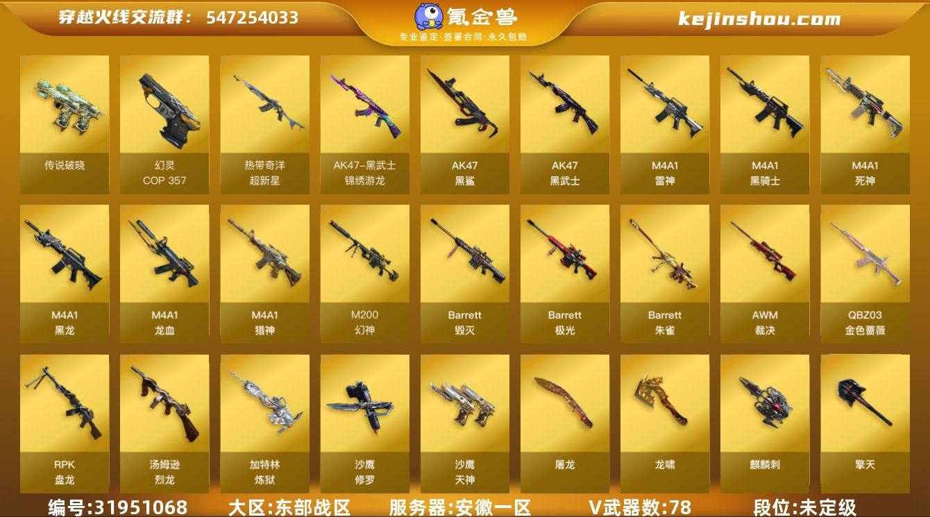 安徽一区-82V-9王者-0炫金 【传说武器】:传说破晓 【热门武器】:传说破晓,QBZ03-金色蔷薇,M4A1-青龙,M200-幻神,Kar98K-星神,M4A1-黑骑士*6,汤姆逊-烈龙*6,RPK-盘龙*5,加特林-炼狱*3,斯泰尔-蝴蝶,羊驼玩偶,雷神-小红,USP-雷暴,COP 357-幻灵,沙鹰-修罗,炽芒蝶刃 【王者炫金武器】:王者之魄高爆手雷,王者之魄闪光弹*4 【音效卡】:QBZ03-金色蔷薇-热带奇洋音效卡,M4A1-黑骑士音效卡,Barrett-毁灭音效卡,Barrett-极光音效卡 【皮肤】:星神-枪娘默 皮肤,雷神-星空,雷神-机甲刑天皮肤,雷神-航星皮肤,火麒麟-雷神*2,毁灭耀金皮肤,黑龙-能量核心,战神-粉色甜心皮肤,战神-流金岁月皮肤,AK47-B-常胜将军-曹操,AK47-B-常胜将军-刘备*2,AK47-B-常胜将军-孙权*2,极光-高能霹雳 皮肤,加特林-炼狱-钟馗皮肤,炼狱-末日审判 皮肤,修罗耀金皮肤 【角色】:电竞教官-云悠悠,关小雨,隼,王者春,王者影豹,奇洋探员,云海玲珑,暗夜-X,初恋灵狐,飞虎队-X,风暴女,嘉年华灵狐,娟娟,灵狐者-X,灵狐者-七夕宝贝,灵狐者-职业经理,龙儿-小淘气,曼陀罗-X,潘多拉-甜心教官,铁骑荣耀,兔囡囡,五号兵器-赛博朋克,樱-战斗天使,游珑儿 【人偶武器】:雷神-小红,天龙-曼陀罗,斯泰尔-蝴蝶,斯泰尔-枪娘暗刃,AWM-灵狐-15周年嘉年华,COP-旗袍,迷你深渊冰龙,迷你波特博士,迷你曼提柯尔,夺魂,迷你火种,迷你生化手雷*5,生化手雷-机甲核心*2,深渊终结者手雷,闪光弹-貂蝉,高爆手雷-大乔,AK12-夜玫瑰 【暴走生化】:异变清道夫,KAC-狂怒咆哮,超级对讲机 【挑战大师】:冰龙粉碎者-白马银枪*2,激光毁灭者III-白马银枪,试炼破坏者III,神圣爆裂者-末日III 【英雄级武器】:M4A1-黑龙,M4A1-雷神,M4A1-黑骑士*6,M4A1-死神,AK47-黑武士,AK47-黑鲨,M4A1-龙血,M4A1-青龙,黑武士-...