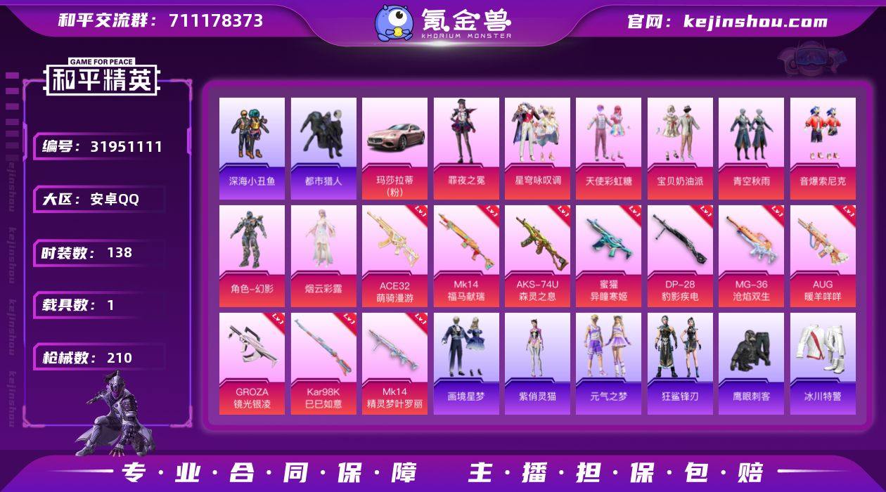 M1046630【地铁满天赋1载具-7粉装-10特效枪小丑鱼,都市猎人,暗影哥特,浪漫天命,深海小丑鱼 宝贝奶油派,星穹咏叹调,天使彩虹糖】安卓手Q-1载具-7粉装-10特效枪-138套装-210枪皮-11王牌印记-超级王牌6星-63294热力值【1载具】玛莎拉蒂Ghibli(粉)【7粉装】青空秋雨,角色-罪夜之冕,音爆索尼克,宝贝奶油派,星穹咏叹调,天使彩虹糖,角色-烟云彩露【10特效枪】GROZA-镜光银凌[5级],ACE32-萌骑漫游[5级],Kar98K-巳巳如意[5级],DP-28-豹影疾电[5级],AUG-暖羊咩咩[5级],AKS-74U-森灵之息[5级],蜜獾-异瞳寒姬[6级],Mk14-福马献瑞[5级],MG-36-沧焰双生[5级],Mk14-精灵梦叶罗丽[7级]【7稀有】小丑鱼,都市猎人,暗影哥特,浪漫天命,深海小丑鱼,AKM-百万伏特,汤姆逊-奇异狩猎者【8飞行器】鸡智如我飞行器,马上有福飞行器,狂鲨锋刃飞行器,炫彩糖果飞行器,冰柠泡泡飞行器,顶峰精英尾迹,光之冒险尾迹,异域银装飞行器【4头盔】幻影战神头盔,金羽特工头盔,童趣迷兔头盔,甜心宝贝头盔【4背包】百万伏特背包,甜心宝贝背包,幻影战神背包,深海小丑鱼背包【324其它衣服和枪皮】角色-紫俏灵猫,SS21特训,牛气冲天,森林游猎者,飞行日记,青翼流星,SS31特训,娇憨猪猪,纯真浪花,狂鲨锋刃,SS28特训,午间小调,猛禽,SS24特训,白糯汤圆,幻世战舞者,SS30特训,炫彩糖果,绯格组合,惊鸿侠骨,萌鸡速递,柠萌假日,天籁歌者,漫步者,星渊小夜曲,猎鹰,白色伏地魔,海岛探路者,SS32特训,萌趣咩咩,幻世保卫者,紫幽梦,轻风白浪,元气发射,云魄琉璃,魅力单车,光之冒险,大橘大利,幻彩翩翩,朱霞炽焰,竞技名士,角色-银尘,燃烧卡路里,冰川特警,漫游都市,恋语绒绒,角色-多纳泰罗,野性山猫,狙击之神,龟仙人,凌霄紫焰,街头潮人,角色-白光莹,琴音绮想,清新柠檬,战术大师,熠彩粉晶,星途旅人,暗黑骑手,蓝调潮人,元素星魂,海盐绵绵冰,角色-冰公主,旭日情侣,王牌教练,福马献瑞,