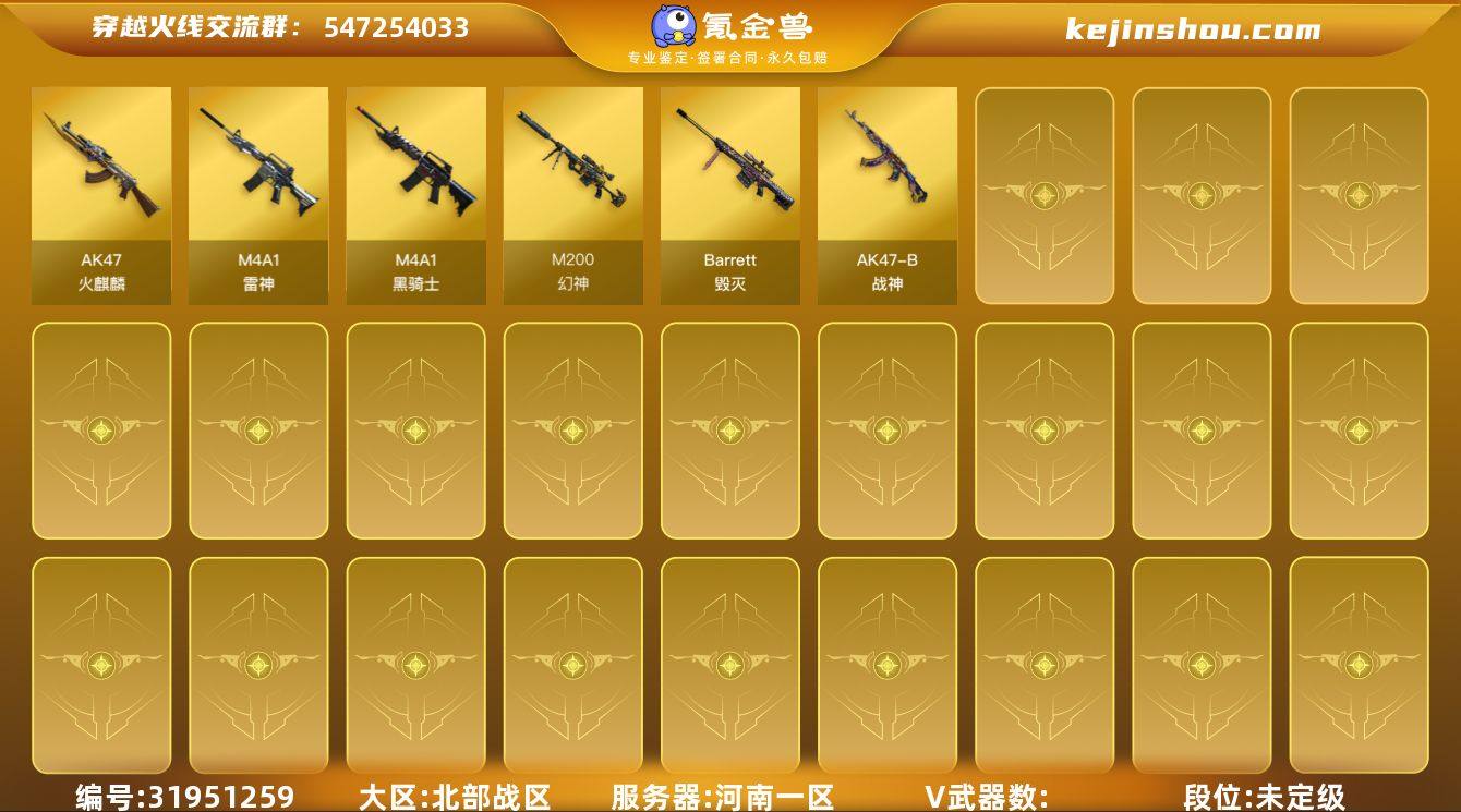 河北一区-55V-1王者-1炫金 【热门武器】:QBZ03-金色蔷薇,死亡之眼,汤姆逊-烈龙*6,RPK-盘龙,沙鹰-修罗*5,高爆手雷-幻兽 【王者炫金武器】:炫金天龙 【皮肤】:雷神-能量核心,火麒麟-心动糖果,毁灭-星空,无影-能量核心,天龙-秘银,极光-能量核心,修罗-能量核心 【角色】:葵,蛇隐宗,暗夜-X,初恋灵狐,电竞少女,虎妞,嘉年华灵狐,曼陀罗-X,蛇姬,斯沃特-X,蜀雪 【人偶武器】:迷你宝贝,AWM-灵狐-15周年嘉年华,COP-旗袍,迷你生化手雷*2,生化手雷-机甲核心 【暴走生化】:死亡之眼 【挑战大师】:激光毁灭者III-白马银枪,激光毁灭者III 【英雄级武器】:AK47-火麒麟,M4A1-黑龙,M4A1-雷神,AK47-无影,AK47-黑武士,AK12-天启,M4A1-武圣,M4A1-玫瑰精灵,QBZ03-金色蔷薇,王者之心-觉醒版,AWM-天龙,Barrett-毁灭,Barrett-极光,AWM-裁决,RPK-盘龙,汤姆逊-烈龙*6,沙鹰-修罗*5,沙鹰-天神,沙鹰-幻兽,Glock18-武圣,屠龙*2,龙啸*2,擎天*2,麒麟刺,女皇利刃-幻兽,高爆手雷-幻兽,高爆手雷-竞技荣光*2,闪光弹-幻兽,闪光弹-竞技荣光*3,闪光弹-云龙*3,烟雾弹-幻兽,烟雾弹-幻灵,烟雾弹-竞技荣光*3,烟雾弹-云龙,烟雾弹-古蛇迷踪 【道具】:CFS限定背包,冰冰企鹅背包,战舰背包,炫彩背包,虎牙炫彩背包,超级背包*2,绿色巨人,灵魂忍者*2,变异宝贝,妖姬,迷雾幽灵*2,生化弹匣,夺命之镰,防化服*2,金色流光-枪王排位*2,枪王排位28赛季金色流光,蛇隐宗表情,EP战队名片,EP战队喷图,EP战队击杀图标,防弹头盔*3,防弹衣*3,C4工具钳*3,手雷包*3 【特殊枪械】:6烈龙,1盘龙