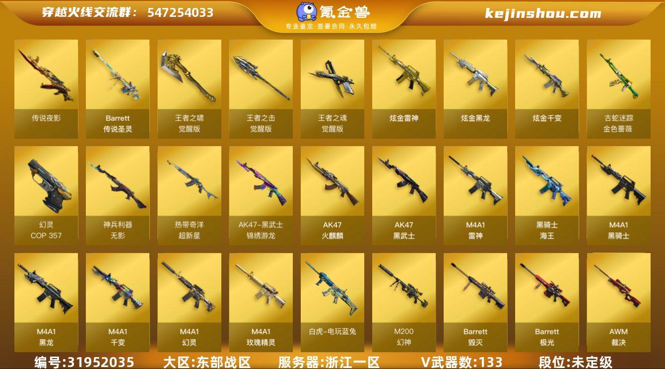 浙江一区-139V-31王者-5炫金 【传说武器】:传说夜影,传说圣灵 【传说角色】:传说艾莉莎 【热门武器】:传说圣灵,传说夜影,QBZ03-金色蔷薇,Scar Light-白虎,M4A1-青龙,M200-幻神*2,金色蔷薇-古蛇迷踪,修罗-古蛇迷踪,M200-竞技荣光,荣耀世冠-火麒麟,荣耀世冠-雷神,白虎-电玩蓝兔,荣耀世冠-柯尔特,Kar98K-星神,炼狱-迷你小钢,M4A1-黑骑士*2,RPK-盘龙*5,加特林-炼狱*2,雷神-小红,COP 357-幻灵*2,沙鹰-修罗,炽芒蝶刃,炽芒蝶刃-破浪逐光 皮肤,荣耀世冠-龙啸,金刚伞 【王者炫金武器】:炫金骑士,炫金黑龙,炫金千变,炫金雷神,炫金武士,王者之魄高爆手雷,王者之魄闪光弹,王者之魄烟雾弹 【音效卡】:M200-幻神音效卡,AK47-火麒麟音效卡,M4A1-雷神音效卡,M4A1-黑龙音效卡,M4A1-黑骑士音效卡*2,Barrett-毁灭音效卡,Barrett-极光音效卡,Scar Light-白虎音效卡,70KG语音包,绝迹语音包,Kar98K-星神音效卡,炼狱-百战金芒-庆典舞曲音效卡,死神-雪域霜狐-怀旧音效卡 【皮肤】:幻神-冠军之幻,M200-幻神-荣耀世冠白鲨,幻神-电流骇客 皮肤,幻神-荣耀世冠白鲨2023 皮肤,白虎-大汉风骨,QBZ03-荣耀世冠白鲨,裁决-羽掣 皮肤,星神-漫游,雷神-暗月,雷神-荣耀之魄,雷神-虎将,雷神-耀金皮肤,雷神-冠军之魄,雷神-宇航兔皮肤,雷神-源计划2.0专属 皮肤,M4A1-再燃火线,火麒麟-冠军之心,火麒麟-华夏之心*2,火麒麟-平天大圣,火麒麟-心动糖果,毁灭-暗月,毁灭-冠军之怒,毁灭-黑曼巴 皮肤,M4A1-千变-孔明皮肤,黑龙-能量核心,黑龙-冠军之武,黑骑士-暗月,黑骑士耀金皮肤,黑骑士-CFS2021,黑骑士-破界 皮肤,无影-神兵利器 皮肤,AK47-黑武士-361,黑武士-典韦皮肤,AK47-B-常胜将军-曹操,AK47-B-常胜将军-刘备,AK47-B-常胜将军-孙权,AWM-天龙-传奇白鲨,极光-能量核心,炼...
