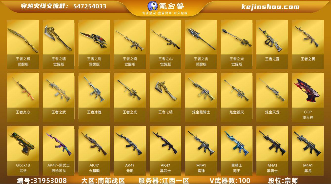 江西一区-102V-29王者-3炫金 【热门武器】:QBZ03-金色蔷薇,HK417-朱雀,M4A1-青龙,M200-幻神,死亡之眼,荣耀世冠-火麒麟,荣耀世冠-雷神,荣耀世冠-柯尔特,王者炎心,Kar98K-星神,金色小号,M4A1-黑骑士,汤姆逊-烈龙*5,RPK-盘龙*6,加特林-炼狱*3,斯泰尔-蝴蝶,羊驼玩偶,降世魔童,火麒麟-绝迹,COP-白鲨,USP-雷暴,COP-堕天神,沙鹰-修罗*2,荣耀世冠-龙啸 【王者炫金武器】:王者冰魄,王者炎心,王者之翼,王者之武,王者之光,王者之霆,王者之啸*2,炫金骑士,炫金毁灭,炫金天龙,王者之魄高爆手雷,王者之魄闪光弹 【音效卡】:AK47-火麒麟音效卡,M4A1-雷神音效卡,M4A1-黑龙音效卡,M4A1-黑骑士音效卡,Barrett-毁灭音效卡,白鲨语音包 【皮肤】:幻神-冠军之幻,雷神-荣耀之魄,雷神-星空,雷神-虎将,雷神-耀金皮肤,雷神-传奇N9,火麒麟-华夏之心*2,AK47-火麒麟-传奇EVEN,火麒麟-轻羽皮肤,火麒麟-平天大圣,毁灭耀金皮肤,毁灭-星空,毁灭-CFS2020,毁灭-BEAN-2020MVP,黑龙-能量核心,黑龙-暗月,M4A1-黑龙-361,黑龙-墨子皮肤,黑骑士-暗月,黑骑士耀金皮肤,黑骑士-冠军之势,黑骑士-地狱火,无影-霓裳皮肤,烈火-动感闪耀 皮肤,AK47-B-常胜将军-曹操*2,AK47-B-常胜将军-孙权,天龙-能量核心,AWM-天龙-传奇70KG,极光-能量核心,修罗-能量核心,修罗耀金皮肤,修罗-星空,屠龙-荣耀之锋,龙啸-冠军之啸 【角色】:零,葵,王者-瞳-闭月羞花,王者零-华冠丽服,王者樱-热浪之夏,王者-葵-貂蝉,王者-魅影,王者玲珑-小乔,蛇隐宗,炽天使,空,北极狐-X,初恋灵狐,电竞少女,芳心审判者,飞虎队-X,娟娟,猎狐者-追月,0号玩家,零-水下丽影,灵狐者-X,灵狐者-黄金海岸,灵狐者-职业经理,流浪蔷薇,曼陀罗-X,潘多拉-X,潜龙队-X,蛇姬,铁骑-乘风破浪,铁骑荣耀,兔囡囡,游珑...