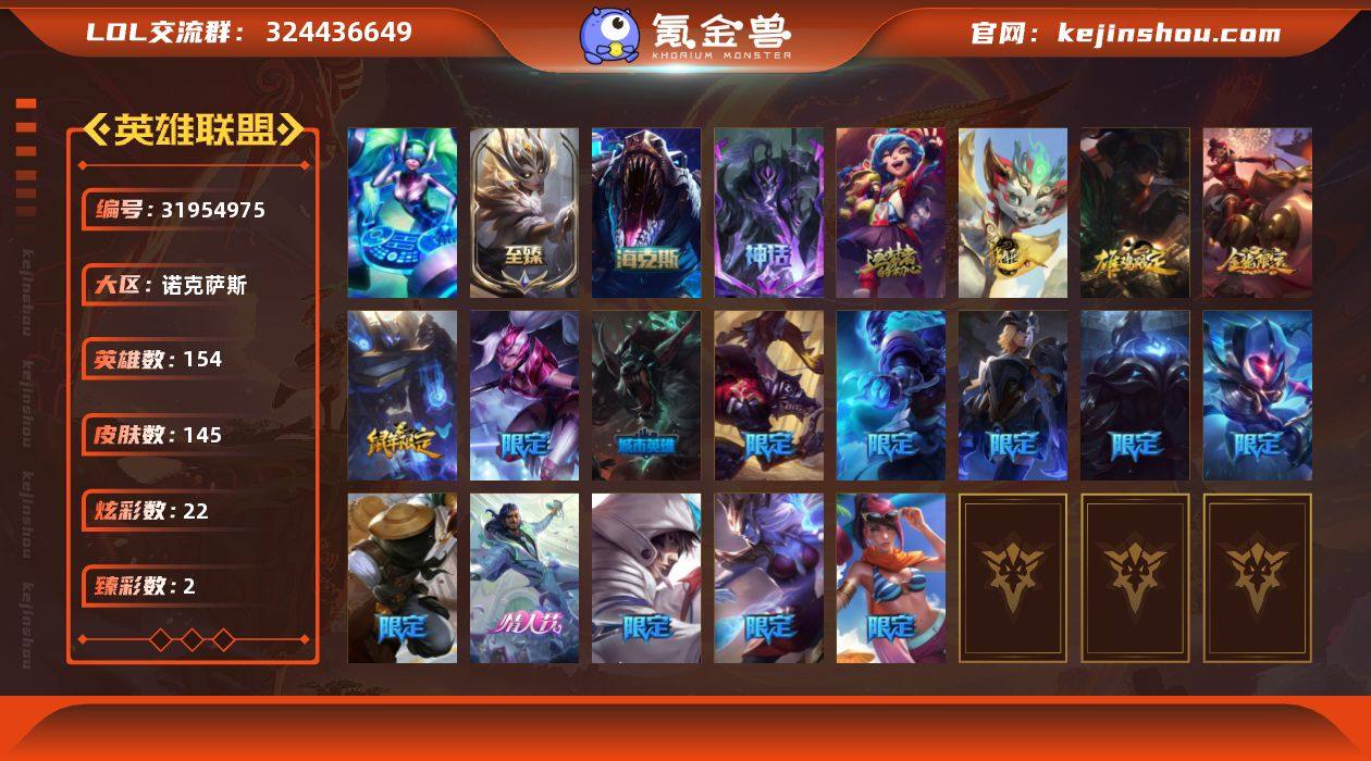 【LOLYH1546】154英雄/145皮肤/1终极/5神话/17限定/2臻彩/22炫彩/21传说/33史诗/未定级/10周年 安妮/10周年庆典 凤凰/灰烬骑士 潘森/海克斯 雷克顿/至臻 魔女 婕拉/玉剑传说 无影 竞星/可爱可爱粉红红 布里茨/虎痴之拳 蔚/金猪烈焰 瑟庄妮/王国机神玄武 盖伦/天龙之子 斯莫德/水晶玫瑰 阿克尚/DJ-娑娜/养蜂人 辛吉德/斩星魔剑 易/冠军典狱长 锤石/冠军之血 希瓦娜/冠军之隐 劫/S4 SSW 泰隆/S6 SKT T1 球女/玉剑传说无影/泳池派对 菲奥娜/暗影 沃里克/勇者 奈德丽/都铎王朝 图奇/地狱之门卫士 加里奥/魔幻卡牌 崔斯特/约德尔国队长 提莫/欧米伽小队 幽灵特工/驯龙炮手 崔丝塔娜/合金巨兽 努努和威朗普/律政大亨 蒙多/灵能特工 娑娜/最终BOSS 维迦/陆地王者4WD 布里茨/地狱行者 孙悟空/神拳 李青/钢铁军团 盖伦/黎明使者 锐雯/星之守护者 拉克丝/黯黑魔龙 希瓦娜/灵魂莲华 阿狸/神王 德莱厄斯/神龙尊者 昼日真龙 亚索/神龙尊者 夜月幻龙 亚索/暗星 锤石/战争机器 赛恩/圣洁化身 索拉卡/火箭达人 崔丝塔娜/荒野豺狼 沃里克/女船长 厄运小姐/紫晶射手 艾希/国王 泰达米尔/死神 卡尔萨斯/武动巅峰 萨科/掠星魔刃 卡萨丁/绝代智将 斯维因/驯龙大师 斯维因/枯萎之壤 雷克顿/龙骑统帅 嘉文四世/法老王朝 内瑟斯/军神战甲 波比/飞车暴走族 古拉加斯/面包之王 潘森/刺客信条 凯南/腥红之月 鬼武者 慎/银河魔装机神 菲兹/生化骑士 德莱厄斯/天启骑士 杰斯/无限烈焰 黛安娜/勇敢的心 奎因/源计划: 风 亚索/腥红之月 亚索/战地机甲 维克兹/源代码 卡蜜尔/屠龙勇士 布隆/五星大厨 塔姆/炼狱魔女 蔚/永恒之森 巴德/风执事加里奥/未来战士崔斯特/黑暗骑士赵信/深渊巨蟹厄加特/后场堡垒阿利斯塔/奥德赛希维尔/星之守护者索拉卡/咖啡甜心索拉卡/约德尔海贼团崔丝塔娜/攻城巨兽努努和威朗普/西部牛仔厄运小姐/冲浪高手辛吉德/黑暗女王...