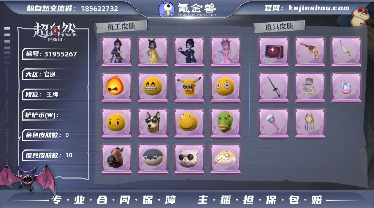 红色皮肤数量:0 金色皮肤数量:0 紫色皮肤数量:5 道具皮肤数量:10