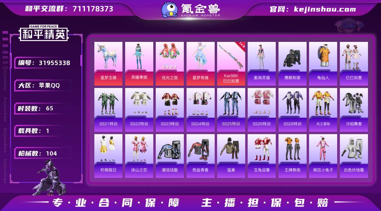 苹果 手Q-3粉装-2特效枪-1载具-0粉色飞行器-26516热力值-2王牌印记-65套装-104枪皮 【热门品类】:套装-龟仙人 【粉色套装】:粉装-炫光之旅,角色-星梦奇缘,角色-异瞳寒姬 【粉色枪皮等级】:Kar98K-巳巳如意(五级),Mk14-福马献瑞(五级) 【粉色载具】:星梦玉骢 【粉色枪皮】:Kar98K-巳巳如意,Mk14-福马献瑞 【粉色降落伞】:暗夜玫瑰降落伞,星梦奇缘降落伞,异瞳寒姬降落伞 【稀有套装】:套装-龟仙人,套装-巳巳如意,套装-雪国风尚,套装-马上有钱,角色-紫俏灵猫 【稀有枪皮】:AKM-破晓战魂,AKM-龙的传人,M16A4-幻世战舞者,SCAR-L-夜灯,SCAR-L-炫彩节奏,SCAR-L-玉兔迎春,M416-糯团青竹,M416-红色方程式,M416-蓝色火焰,GROZA-彩虹符号,GROZA-影袭,GROZA-懵萌河马,AUG-天降萌叽,AUG-耀粉歌者,M762-天降萌叽,M762-彩虹符号,M762-第五大道,Mk47-妙红点点,G36C-懵萌河马,AC-VAL-天降萌叽,蜜獾-天降萌叽,UZI-啾咪啾咪,UZI-影袭,UZI-炫彩节奏,UZI-红色方程式,UZI-幻影飞狐,UMP45-蓝色火焰,UMP45-绒宝小鹅,Vector-生命誓言,Vector-音爆索尼克,汤姆逊-天降萌叽,汤姆逊-耀粉歌者,P90-巳巳如意,Kar98K-王子的夏天,Kar98K-红色方程式,M24-影袭,M24-炫彩节奏,SKS-糯团青竹,VSS-彩虹符号,VSS-星之彼岸,Mini14-耀粉歌者,SLR-彩虹符号,莫辛纳甘-懵萌河马,AMR-妙红点点,AMR-喜羊羊与灰太狼,M417-惊鸿侠骨,M200-惊鸿侠骨,S686-红色方程式,S686-巳巳如意,S1897-炫彩节奏,S12K-玩趣呆呆,S12K-破晓战魂,DBS-第五大道,M249-妙红点点,M249-彩虹符号,M249-破晓战魂,M249-糯团青竹,DP-28-彩虹符号,MG3-妙红点点,MG3-幻世战舞者,MG3-惊鸿侠骨,MG3-第五大道,PKM-懵萌河马,爆炸猎弓-惊鸿侠骨,破片手榴弹-巳巳如意 【其他套装】:套装-SS21特训,套装-SS22特训,套...
