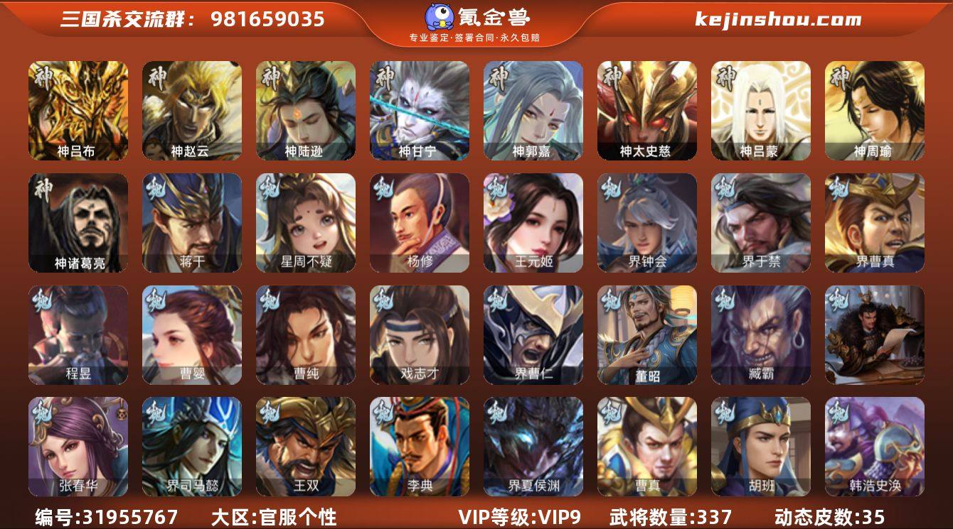 官阶:大将军;VIP等级:VIP9;史诗武将数量:41;动态皮肤数量:35;武将总数:337;史诗宝珠数量:60;将魂数量:3132;神将:7;魏国史诗武将:20;蜀国史诗武将:7;吴国史诗武将:5;群史诗武将:12 神吕布,神赵云,神陆逊,神甘宁,神郭嘉,神太史慈,神诸葛亮,星周不疑,杨修,王元姬,界钟会,界于禁,界曹真,曹婴,曹纯,戏志才,蒋干,程昱,谋赵云,谋马超,诸葛瞻,沙摩柯,谯周,花鬘,谋关羽,周处,骆统,留赞,界朱然,界徐盛,裴秀,左慈,星黄忠,麹义,沮授,界左慈,界李儒,公孙康,卑弥呼,谋张角,许攸,兀突骨,神吕蒙,神周瑜,SP关羽,SP曹仁,SP蔡文姬,乐进,曹昂,诸葛诞,朱灵,文聘,SP姜维,张春华,钟会,曹冲,郭淮,满宠,界王异,界曹操,界司马懿,界夏侯惇,界张辽,界许褚,界郭嘉,李典,曹真,韩浩史涣,陈群,曹叡,钟繇,司马朗,王基,李通,郭皇后,辛宪英,吕虔,鲁芝,界荀彧,杜畿,贾逵,界曹植,界曹彰,界郭淮,卞夫人,辛毗,界陈群,蔡贞姬,袁涣,王双,崔琰,杨阜,阮慧,谋徐晃,谋于禁,界曹休,牵招,胡班,界夏侯渊,界曹仁,臧霸,唐咨,董昭,势陈到,SP孙尚香,关银屏,夏侯霸,马良,关兴张苞,廖化,界马岱,关平,刘封,界法正,界关兴张苞,界刘备,界关羽,界赵云,SP徐庶,吴懿,周仓,张松,刘谌,糜竺,马忠,李严,黄皓,吴苋,秦宓,界诸葛亮,严颜,界伊籍,界庞统,吕凯,杨仪,邓芝,费祎,糜夫人,界周仓,许靖,彭羕,界张嶷,谋姜维,谋张飞,诸葛果,界魏延,蒋琬费祎,糜芳傅士仁,甘夫人,孙茹,凌操,诸葛恪,诸葛瑾,孙鲁育,程普,韩当,潘璋马忠,虞翻,朱然,界甘宁,界吕蒙,界黄盖,界周瑜,界大乔,界陆逊,孙鲁班,朱桓,顾雍,孙休,朱治,全琮,步骘,徐氏,薛综,界孙权,界孙尚香,潘濬,SP庞统,陆绩,孙亮,严畯,吕岱,陆抗,许贡,卫温诸葛直,界虞翻,界潘璋马忠,孙邵,桥公,陈武董袭,孙翊,界顾雍,界孙鲁班,谋韩当,谋吕蒙,界孙休,界朱治,谋小乔,孟达,友徐庶,友庞统,蔡文姬,伏完,刘协,界袁术,SP赵云,SP貂蝉,张宝,伏皇后...