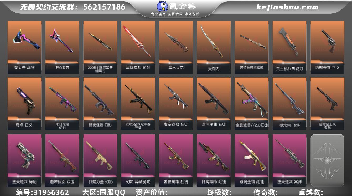 段位: 未定级 亮点皮肤: 悲悯之刃 套装: 2025全球冠军赛,VCT LOCK//IN 近战武器皮肤: 天御刀-天界神兵//2.0,荒土机兵热能刀,阿特拉斯指挥部,魔术火花-奇幻朋克3.0,星际猎兵 短剑,2025全球冠军赛 蝴蝶刀,碎心裂刃,蒙太奇 战斧 步枪皮肤: 狂徒-紫阙金琅,幻影-侦察力量,狂徒-盖世英雄,戍卫-般若假面,狂徒-日冕雄师,狂徒-全息波普//2.0,狂徒-混沌序曲,幻影-黯夜怪谈,幻影-异鳞魔蛇,狂徒-虚空遗器,幻影-末日泡泡,2025全球冠军赛 狂徒,超集系统 狂徒,蒙太奇 幻影,风暴之子 戍卫 佩枪皮肤: 正义-奇点,标配-堕天遗武,正义-西部未来,鬼魅-超时空卫队,超集系统 标配,风暴之子 正义,蒙太奇 狂怒 狙击枪皮肤: 飞将-塑水宗,冥驹-堕天遗武,风暴之子 冥驹,超集系统 飞将 冲锋枪皮肤: 蒙太奇 骇灵 霰弹枪皮肤: 风暴之子 雄鹿 机枪皮肤: 蒙太奇 战神