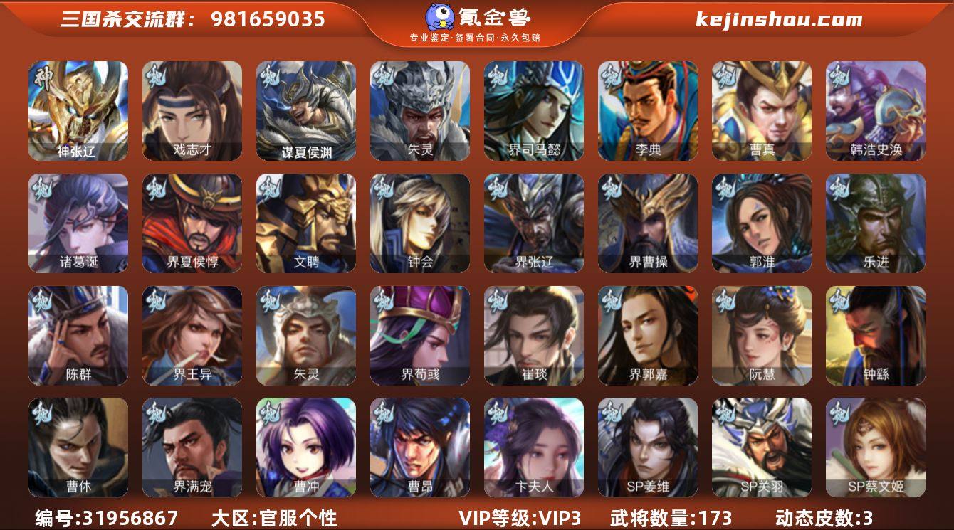 VIP等级: VIP3 官阶: 先锋将军 武将数量: 173 动态皮肤数量: 3 神将: 神张辽 魏国武将: 戏志才,张辽,SP蔡文姬,SP关羽,SP贾诩,SP姜维,卞夫人,曹昂,曹操,曹冲,曹洪,曹丕,曹仁,王异,界满宠,曹休,钟繇,郭嘉,荀彧,阮慧,界郭嘉,崔琰,界荀彧,朱灵,界王异,陈群,乐进,郭淮,夏侯惇,曹植,界曹操,许褚,界张辽,钟会,文聘,界夏侯惇,诸葛诞,司马懿,甄姬,徐晃,韩浩史涣,曹真,典韦,夏侯渊,李典,于禁,邓艾,界司马懿,朱灵(国战),谋夏侯渊 蜀国武将: 谯周,徐庶,界黄月英,界张嶷,赵云,张松,李丰,界刘备,刘封,糜竺,黄月英,刘巴,关羽,吴懿,张飞,魏延,马忠,界法正,刘禅,关银屏,界祝融,SP孙尚香,SP徐庶,卧龙诸葛,周仓,界关兴张苞,诸葛亮,法正,赵统赵广,界马岱,关平,马岱,界庞统,庞统,谋张飞,马谡,马超,关兴张苞,孟获,黄忠,刘备,界马超,李严,马良,刘谌,SP甘夫人 吴国武将: 周泰,吕蒙,丁奉,蒋钦,顾雍,孙休,界孙权,祖茂,孙尚香,程普,大乔,韩当,陆逊,诸葛瑾,太史慈,虞翻,界黄盖,孙鲁班,界周瑜,孙权,界甘宁,吴国太,甘宁,界大乔,孙坚,步练师,周瑜,小乔,潘璋马忠,黄盖,孙策,界陆逊,张昭张纮,陈武蕫袭,张奋,孙邵,朱桓 群国武将: 麹义,许攸,伏完,刘协,华雄,刘琦,袁术,于吉,界公孙瓒,吕布,李儒,张济,公孙瓒,SP赵云,蔡夫人,潘凤,界袁术,陈宫,谋张角,界华佗,贾诩,庞德,张宝,荀谌,刘表,董卓,张角,袁绍,华佗,貂蝉,伏皇后,界吕布,公孙渊,颜良文丑,张鲁,谋刘赪,马腾,纪灵