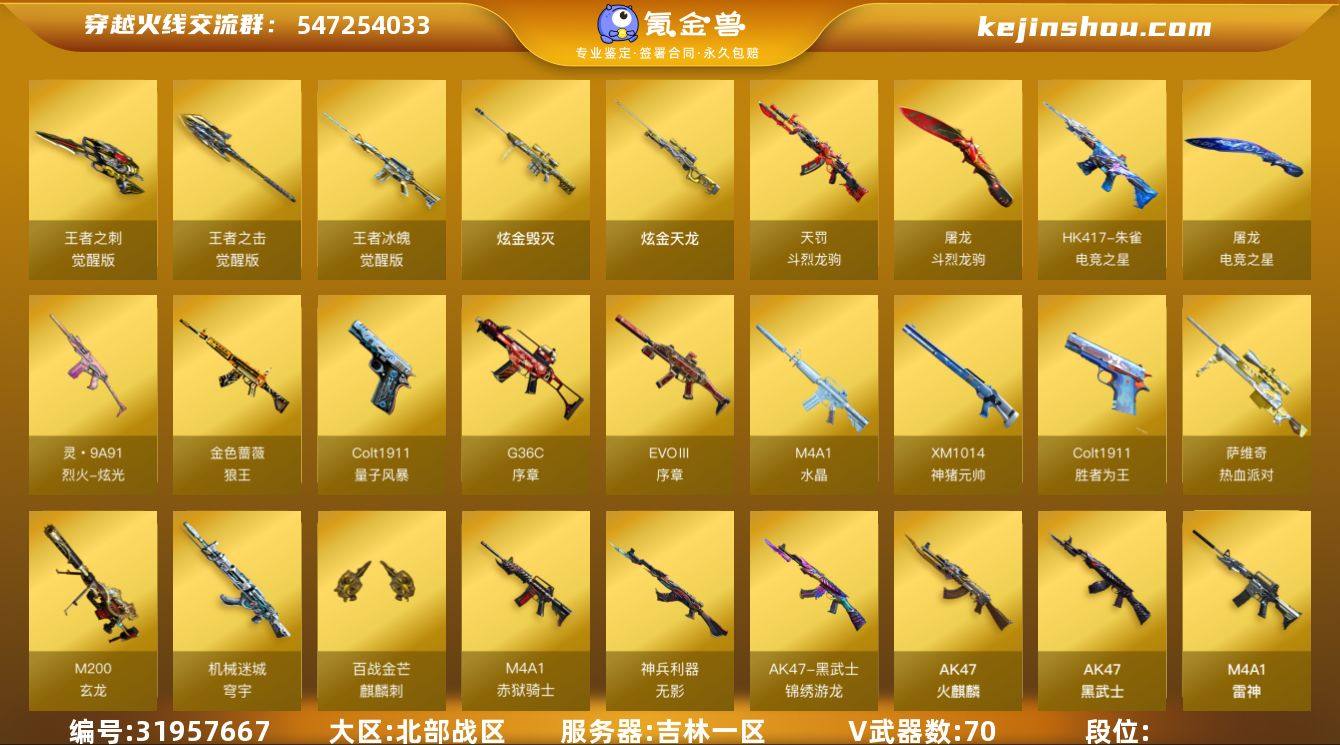 北部战区(吉林一区)lb【精美爆破号】70v【M200-幻神套装+双皮/荣耀世冠白鲨/纸灯龙,竞技荣光套装,G36C-幻影,QBZ03-金色蔷薇,白虎-电玩蓝兔,M14EBR-玄武,天罚-斗烈龙驹,QBZ03-独角-I,AWM-裁决+双皮/运输船/胜者为王,USP-雷暴,柯尔特-竞技荣光,金刚伞,修罗-云海游龙】5王者【王者冰魄,王者之刺,王者之击】2炫金【炫金毁灭,炫金天龙】11角色【四防电竞教官-云悠悠,四防王者瞳-闭月羞花,王者凌霄,葵,不败狙神,斗烈龙骑,幻面灵狐,葵-阿尔法武装,乔伊教练,修道士,雪域霜狐,灵动武士,四防樱-青春偶像,职业选手】9音效【M200-幻神音效卡,M4A1-黑骑士音效卡,HK417-朱雀-电竞之星-竞星跃动音效卡,炼狱-百战金芒-庆典舞曲音效卡,AN94-竞魂超新星音效卡,屠龙-斗烈龙驹-斗烈音效卡,屠龙-电竞之星-竞星跃动音效卡,天罚-斗烈龙驹-斗烈音效卡】45皮【幻神-荣耀世冠白鲨,幻神-纸灯龙,毁灭-冠军之怒,修罗-冠军之魂,龙啸-纸灯龙,黑骑士-伏羲,雷神-机甲刑天,黑骑士-摸金校尉,裁决-运输船,裁决-胜者为王,毁灭-风暴,火麒麟-百城,屠龙-惊鸿,雷神-宇航兔,火麒麟-巅峰荣耀,火麒麟-雷神,雷神-宠儿,火麒麟-心动糖果,毁灭-神秘黑洞,毁灭-墨兰,火麒麟-AG战队,毁灭-荣耀之怒,毁灭-黑大圣,火麒麟-CF STAR,雷神-荣耀之魄,雷神-星空,屠龙-荣耀之锋,毁灭-英雄计划,修罗-CF STAR】VIP6截图展示段位不代表实际段位 如赛季更新等不可抗拒因素发生变化、时限道具不保证所剩时间
