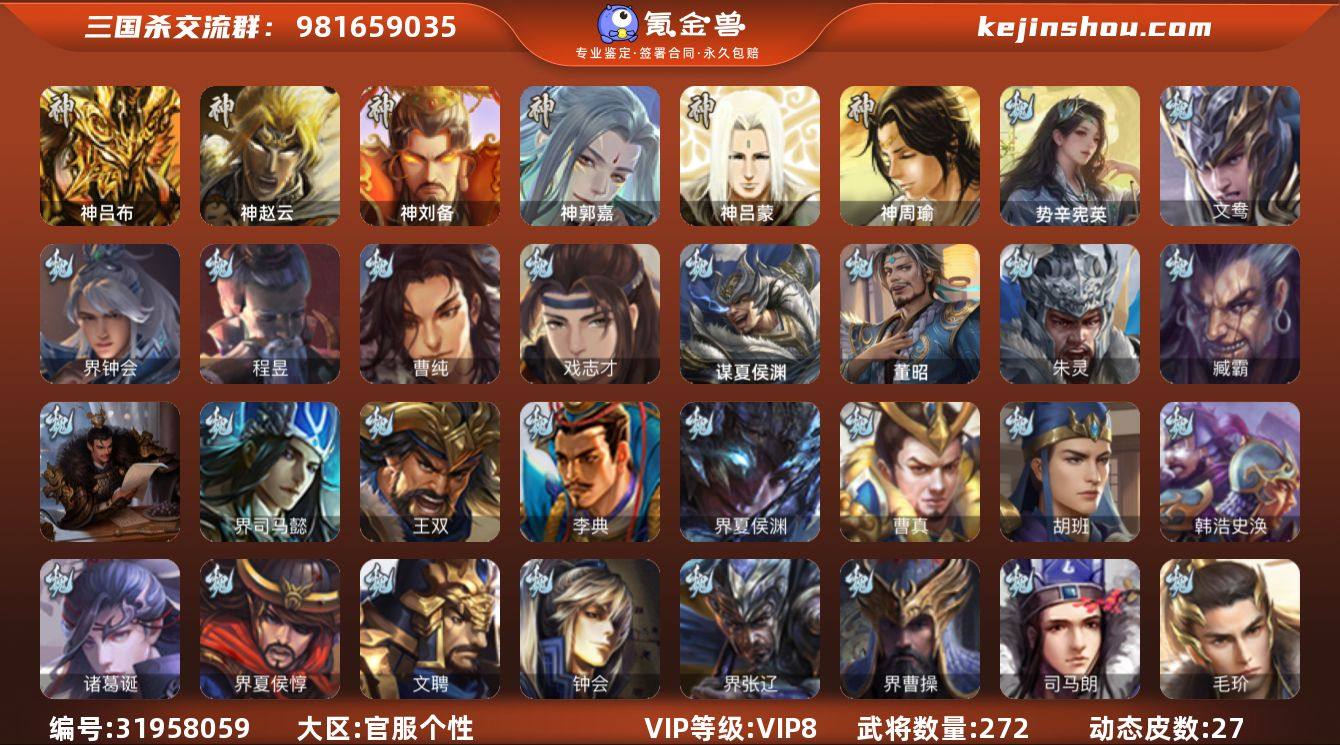 VIP等级: VIP8 官阶: 骠骑将军 武将数量: 272 动态皮肤数量: 27 神将: 神郭嘉,神刘备,神吕布,神赵云,神吕蒙,神周瑜 魏国武将: 戏志才,曹纯,程昱,界钟会,文鸯,唐咨-魏,张辽,SP蔡文姬,SP关羽,SP贾诩,SP姜维,卞夫人,蔡贞姬,曹昂,曹操,曹冲,曹洪,曹丕,曹仁,曹叡,王异,鲁芝,曹休,界曹植,荀攸,钟繇,郭嘉,牵招,荀彧,阮慧,杜畿,界郭嘉,崔琰,朱灵,界甄姬,界王异,华歆,陈群,袁涣,乐进,辛宪英,郭淮,毛玠,夏侯惇,曹植,司马朗,谋于禁,界曹操,许褚,界张辽,张郃,钟会,文聘,曹彰,界夏侯惇,诸葛诞,司马懿,甄姬,徐晃,韩浩史涣,胡班,曹真,典韦,界夏侯渊,夏侯渊,李典,于禁,王双,邓艾,界司马懿,孟达-魏,臧霸,朱灵(国战),董昭,谋夏侯渊,势辛宪英 蜀国武将: 花鬘,谯周,张星彩,赵襄,谋马超,谋赵云,马云騄,徐庶,界魏延,吕凯,界关羽,界诸葛亮,邓芝,界黄月英,界张嶷,赵云,张松,彭羕,李丰,界刘备,刘封,糜竺,谋庞统,黄月英,关羽,吴懿,吴班,祝融,张飞,黄皓,魏延,马忠,界法正,刘禅,界赵云,张翼,关银屏,SP孙尚香,SP徐庶,卧龙诸葛,周仓,简雍,界关兴张苞,诸葛亮,界张飞,法正,界简雍,赵统赵广,界马岱,关平,马岱,庞统,诸葛果,谋张飞,马谡,马超,廖化,关兴张苞,孟获,姜维,黄忠,刘备,界马超,李严,马良,彭羕(国战),甘夫人,SP甘夫人,势陈到 吴国武将: 界徐盛,界朱然,文鸯,周泰,全琮,吕蒙,诸葛恪,大乔小乔,桥公,谋周瑜,丁奉,界全琮,蒋钦,顾雍,界朱治,界孙权,祖茂,濮阳兴,界吕蒙,孙登,凌操,朱治,孙尚香,程普,大乔,韩当,陆逊,诸葛瑾,太史慈,虞翻,界黄盖,孙鲁班,界周瑜,孙权,谋小乔,界甘宁,界韩当,甘宁,界大乔,孙坚,孙鲁育,凌统,步练师,周瑜,小乔,潘璋马忠,黄盖,吕岱,孙策,界陆逊,吴-唐咨,谋韩当,徐盛,张昭张纮,陈武蕫袭,孙邵,朱桓 群国武将: 界李儒,界左慈,麹义,兀突骨,星黄忠,许攸,伏完,华雄,董白,袁术,高顺,刘繇,界庞德,于吉,界公孙瓒,吕布,李儒,界貂蝉,公孙...