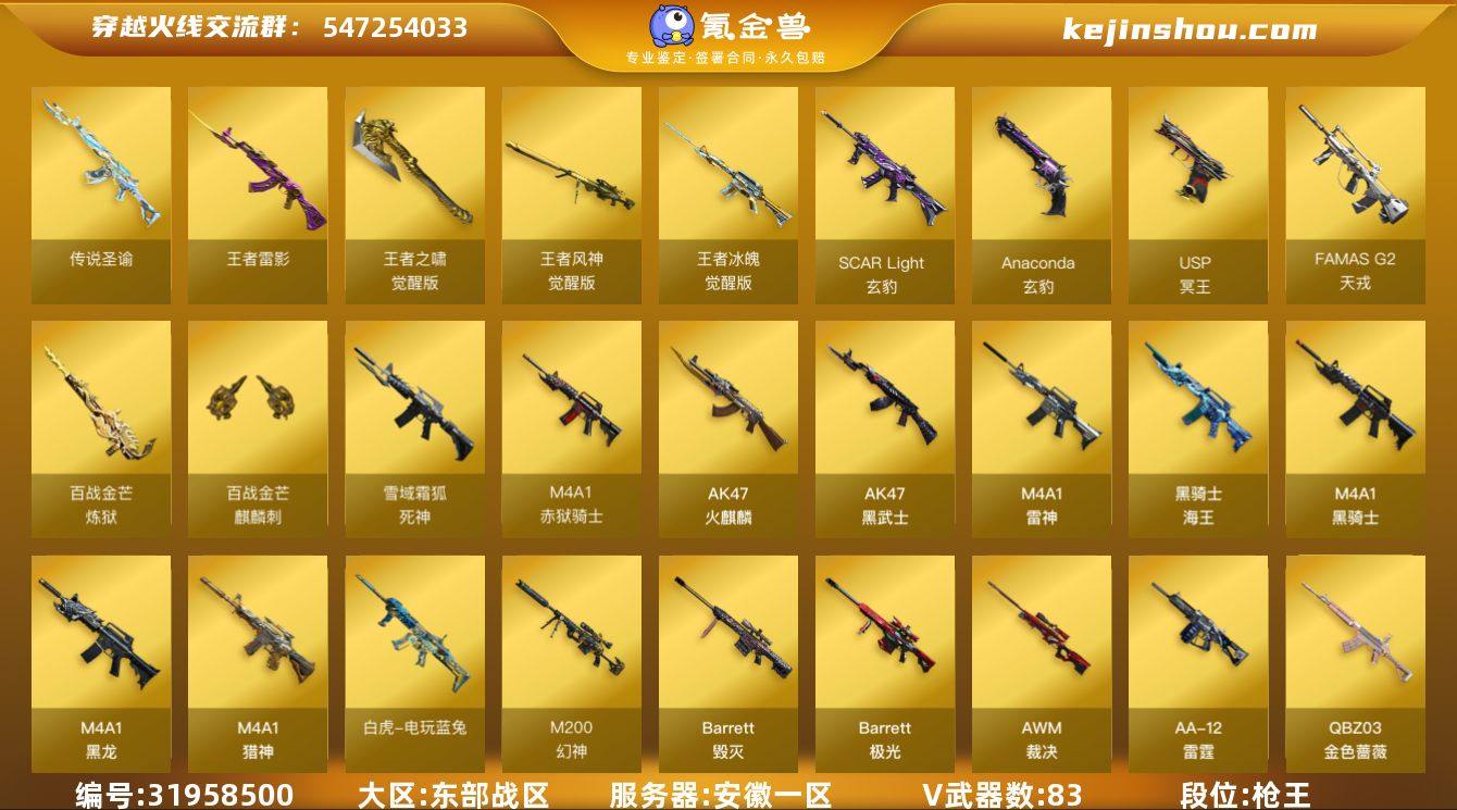 安徽一区-90V-9王者-0炫金 【传说武器】:传说圣谕 【传说角色】:传说星骇 【热门武器】:传说圣谕,QBZ03-金色蔷薇,M200-幻神,死亡之眼,白虎-电玩蓝兔,柯尔特-冠军之特,毒蜂,M4A1-黑骑士,汤姆逊-烈龙*6,加特林-炼狱,COP-白鲨,沙鹰-修罗*2 【王者炫金武器】:王者雷影,王者之魄高爆手雷,王者之魄闪光弹*2 【音效卡】:AWM-裁决音效卡,QBZ03-天罚音效卡,Barrett-碧霄极光音效卡,炼狱-百战金芒-庆典舞曲音效卡,死神-雪域霜狐-怀旧音效卡,AK47-火麒麟-怀旧音效卡 【皮肤】:幻神-丹凤,幻神-电流骇客 皮肤,幻神-荣耀世冠EP 皮肤,QBZ03-冠军之薇,裁决-运输船 皮肤,星神-璀璨皮肤,雷神-暗月,雷神-源计划2.0专属 皮肤,M4A1-再燃火线,火麒麟-平天大圣,火麒麟-心动糖果,毁灭-冠军之怒,黑骑士-暗月,天罚-课桌奇兵 皮肤,战神-粉色甜心皮肤*2,战神-紫绶金章皮肤,战神-流金岁月皮肤,AK47-B-常胜将军-刘备*3,极光-高能霹雳 皮肤,炼狱-玩具枪皮肤,修罗-百战金芒 皮肤,屠龙-荣耀世冠AG,屠龙-星火燎原,屠龙-春桃 皮肤,屠龙-惊鸿 皮肤,轻型军用手斧-再燃火线 【角色】:魅影,雨棠,机械姬,隐,妮妮,王者-瞳-闭月羞花,王者-魅影,王者玲珑-小乔,王者潘多拉,雪域霜狐,乔伊教练,云海玲珑,炽天使,暗夜-X,初恋灵狐,风暴女,疾风,娟娟,卡塔琳娜,兰妹妹,零-水下丽影,灵狐-花神,灵狐者-黄金海岸,龙儿,龙儿-小淘气,麻雀,曼陀罗-X,玫瑰花神,潘多拉-甜心教官,潜龙队-X,青霞仙子,蛇姬,斯沃特-X,铁骑荣耀,雪莉杨,影武者-X,智影 【人偶武器】:COP-白鲨,火麒麟-灵狐,迷你救赎猎手,异变清道夫-蛇影双骄,AWM-灵狐-15周年嘉年华,M37-葵,迷你深渊冰龙,夺魂,迷你牛牛,迷你生化手雷*2,生化手雷-机甲核心*3,深渊终结者手雷*2,闪光弹-小乔,闪光弹-貂蝉,高爆手雷...