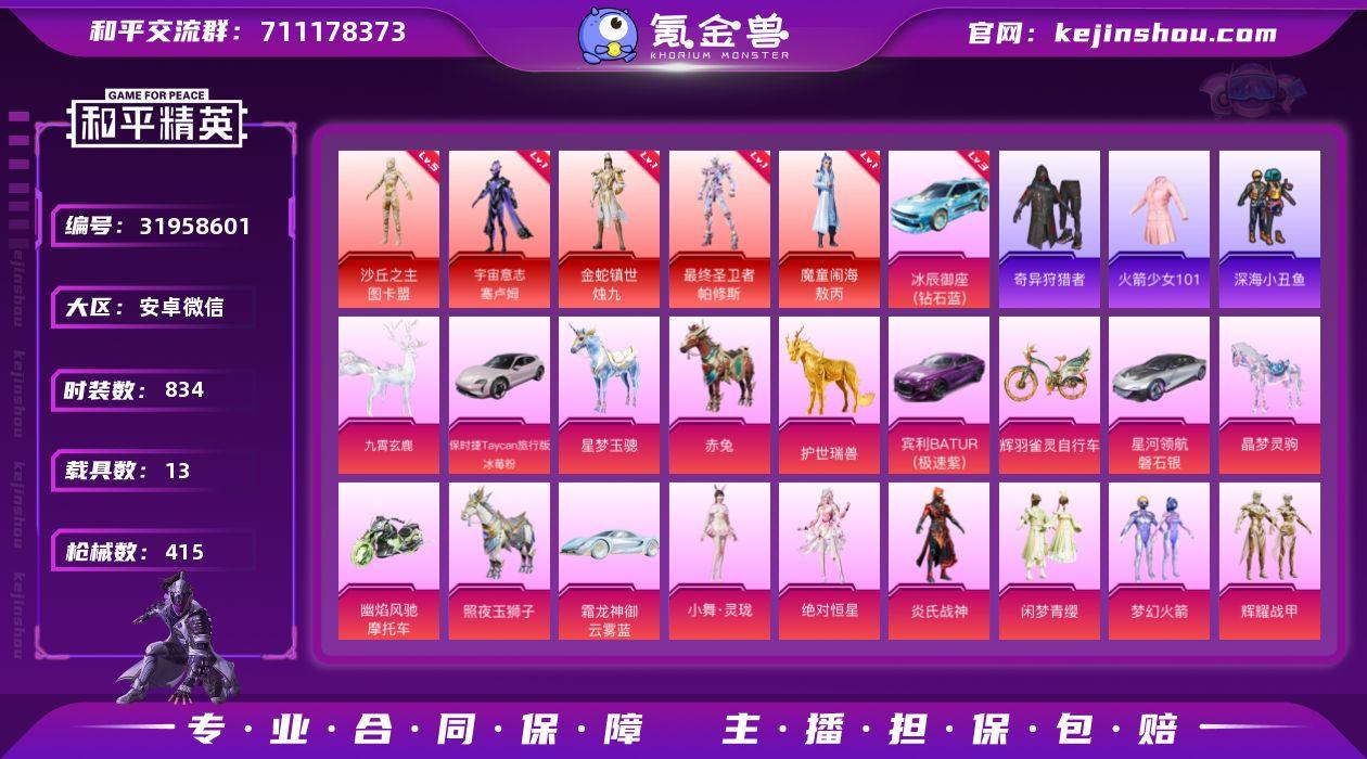 实名:不可二次实名 是否支持人脸包赔:支持 粉装数量:40 特效枪数量:63 载具数:13 时装数:834 枪械数:415 火箭少女101,奇异狩猎者,深海小丑鱼 五级沙丘之主-图卡盟,一级金蛇镇世-烛九,一级魔童闹海-敖丙,一级宇宙意志-塞卢姆,一级最终圣卫者-帕修斯 三级冰辰御座(钻石蓝) 小舞·灵珑,绝对恒星,白兰星,冰霜白皇,彩虹鹿灵,呆萌星弥,第五大道,蝶舞蔷薇,复仇流浪者,凤凰座 一辉,繁龙极客,幻彩电音,幻影飞狐,辉耀战甲,精灵娃娃,狂魇小丑,冷魅冰骑,洛天依,罗征,莲影清波,梦幻火箭,蜜桃特工,千金淑猫,奇迹舞步-美雪,山涧鹿灵,圣堂之誓,天龙座 紫龙,万古烈焰,未来歌姬,霞光圣骑,炫光之旅,小可学妹,闲梦青缨,星穹咏叹调,星云暗核,银龙傲海,炎氏战神,樱桃泡泡,烟云彩露,宙之时溯 八级M416-灵猫魔法师,七级燃烧瓶-薄荷可可,七级破片手榴弹-粉粉猫爪,六级ARX-萌骑跃动,六级AKM-暮色玫影,六级GROZA-超新星,五级M338-回旋牧梦使,五级AKS-74U-森灵之息,五级M249-绝对恒星,五级DP-28-豹影疾电,五级MG-36-沧焰双生,五级AMR-炫光之旅,五级Kar98K-巳巳如意,五级M16A4-晶梦幻蝶,五级PKM-江南烟雨,四级MG3-萌骑闯关,四级AKS-74U-无垠阁,四级AUG-星梦奇缘,四级Famas-初号机 觉醒Ver.,四级Kar98K-未来歌姬,四级M417-第五大道,四级MG-36-幻梦之森,四级蜜獾-辉耀战甲,四级SVD-月影灵韵,四级汤姆逊-冰川粉黛,四级UMP45-相思残雪,四级UZI-绮梦青鸾,四级Vector-环太平洋,四级野牛-绯月迷踪,四级烟雾弹-丁香清露,三级SCAR-L-灵驹仙姬,三级信号枪-金乌曜日,三级P90-魔童闹海 敖丙,三级DP-28-枪炮玫瑰,三级M200-梦海之灵,三级M24-镜域双华,三级MK14-盛世惊鸿,二级MP7-G-水中影,二级M762-冷魅冰骑,二级S1897-蓝晶绮麟,一级AA12-G-萌骑幻想,一级ACE32-萌骑漫游,一级PKM-萌骑夺宝,一级UMP45-萌骑冒险,一级M249-霁蓝缠春,一级ARX-无垠阁,一级AKM-白勺歌姬,一级AKM-熔岩统帅,一级AKS-74U-信仰神谕,一级AUG-超新星,一级M249-绒雪飘舞,一级M24-莲影清波,一级M416-超新星,一级M416-五爪金龙,一级MG3-辉羽雀灵,一级MG3-梦幻舞会,一级MK14-闲梦青缨,一级MK14-樱桃泡泡,一级P90-粉樱探戈,一级SCAR-L金蛇镇世,一级SCAR-L-甜梦小狐,一级SCAR-L-万古烈焰,一级UMP45-宇宙意志 九霄玄鹿,保时捷Taycan旅行版(冰莓粉),宾利BATUR(极速紫),赤兔,护世瑞兽,辉羽雀灵自行车,晶梦灵驹,霜龙神御(云雾蓝),星河领航(磐石银),星梦玉骢,幽焰风驰摩托车,照夜玉狮子 狙击之神,彩虹骑师,马上有钱,暖阳柴柴,幽雨猫猫,福马献瑞,红釉青花,SS37特训,雨过天青,青翼流星,雪国风尚,画境星梦,琴音绮想,SS36特训,火箭少女101,奇异狩猎者,炫彩糖果,粉黛兰香,萌鸡速递,风迹短诗,SS35特训,午间小调,超感刻度,甜心蒙太奇,元气之梦,申公豹,漫游都市,美羊羊,喜羊羊,薄荷星砂,狂鲨锋刃,凌霄紫焰,擎苍青焰,SS34特训套装,游乐,朱霞炽焰,2B战斗服款,2P战斗服款,暗金炫舞,暗影哥特,冰冻风暴,缤纷果语,白光莹,冰河战士,贝吉塔,贝斯之夜,白熊同盟,璀璨流光,春光漫游,彩虹兔,雏菊兔兔,长空猛禽,春日漫步,超人