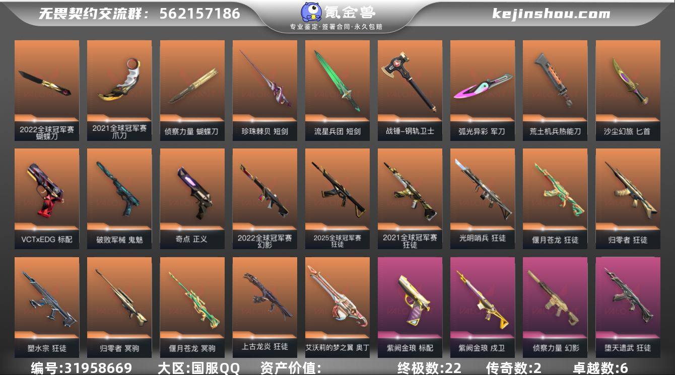 【9.7w库存23冠军套.24冠军套.25冠军套.猫猫套.仙女棒.黑波之刃.17狂徒6幻影】YXy5608【无二次】【因赛季更新游戏段付以上号为准!】 【套装】:2025全球冠军赛套装,2024全球冠军赛套装,2023全球冠军赛套装,艾沃莉的梦之翼套装,末日泡泡套装,RGX 11z Pro//3.0套装,奇点//2.0套装,回火礼包:奇点套装,无畏启程套装 【英雄】:幻棱,炼狱,维斯,暮蝶,钛狐,壹决,铁臂,捷风,雷兹,幽影,不死鸟,贤者,猎枭,蝰蛇,零,芮娜,奇乐,尚勃勒,霓虹,斯凯,夜露,星礈,K/O,海神,盖可,黑梦,钢锁 【近战武器】:近战武器-2025全球冠军赛 蝴蝶刀,近战武器-2024全球冠军赛 战刀,近战武器-2023全球冠军赛 苦无,近战武器-碎心裂刃,近战武器-泡泡电锯,近战武器-奇点//2.0 蝴蝶刀,近战武器-紫金爪刀,近战武器-RGX 11z Pro//3.0 爪刀,近战武器-黑波之刃,近战武器-艾沃莉的魔法棒,近战武器-流星兵团 短剑,近战武器-超能偶像 应援棒,近战武器-超限闪存 匕首,近战武器-合金战车 军刀,近战武器-沙尘幻旅 匕首,近战武器-天玄刀,近战武器-星际猎兵 短剑 【狂徒】:狂徒-艾沃莉的梦之翼,狂徒-超时空卫队,狂徒-2025全球冠军赛,狂徒-2023全球冠军赛,狂徒-归零者,狂徒-洪荒怒焰,狂徒-混沌序曲,狂徒-奇点//2.0,狂徒-全息波普//2.0,狂徒-塑水宗,狂徒-偃月苍龙,狂徒-多弥尔的复仇,狂徒-掠影,狂徒-盖亚的复仇,狂徒-海洋之星,狂徒-起源,狂徒-日冕雄师,狂徒-超能偶像,狂徒-流星兵团,狂徒-沙尘幻旅 【幻影】:幻影-2024全球冠军赛,幻影-奇点,幻影-千灵华绽,幻影-末日泡泡,幻影-天界神兵//2.0,幻影-侦察力量,幻影-超限闪存,幻影-合金战车,幻影-聚合之力 【戍卫】:戍卫-掠影,戍卫-超能偶像,戍卫-浮光跃金,戍卫-花漾粉红,戍卫-萌彩剪影,戍卫-战术熊与伙伴们 【獠犬】:獠犬-采蜜小...