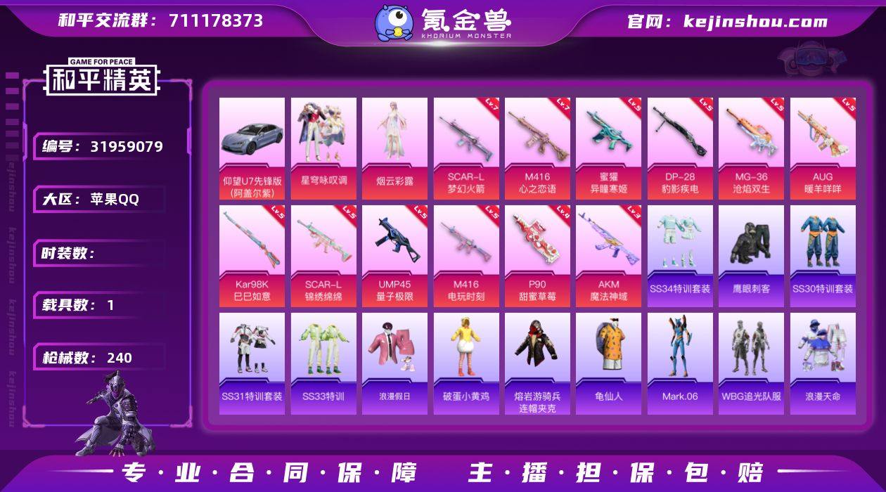 苹果 手Q-7粉装-16特效枪-3载具-4粉色飞行器-76170热力值-9王牌印记-154套装-231枪皮 【热门品类】:套装-浪漫天命,套装-小丑鱼,角色-军刀雅典娜,套装-胖达圆圆,套装-龟仙人 【粉色套装】:粉装-星之彼岸,粉装-筑梦精灵,粉装-射星猎手,玩偶服-猪猪侠,粉装-幻彩电音,角色-狂魅哈莉,角色-冰魄 【粉色枪皮等级】:SCAR-L-纯梦嫁纱(五级),M416-五爪金龙(七级),ACE32-萌骑漫游(四级),UMP45-萌骑冒险(二级),AKS-74U-信仰神谕(五级),AKS-74U-森灵之息(四级),P90-沙丘之主(三级),Kar98K-巳巳如意(五级),SKS-碧影闪光(四级),Mk14-福马献瑞(五级),SLR-暗夜玫瑰(四级),AMR-鸢尾晶梦(五级),M417-第五大道(四级),DP-28-豹影疾电(五级),MG3-洛神天依(五级),MG-36-沧焰双生(五级) 【粉色载具】:宾利BATUR(极速紫),永恒黄蜂,飞驰奶龙龙 【粉色枪皮】:SCAR-L-纯梦嫁纱,M416-五爪金龙,ACE32-萌骑漫游,UMP45-萌骑冒险,AKS-74U-信仰神谕,AKS-74U-森灵之息,P90-沙丘之主,Kar98K-巳巳如意,SKS-碧影闪光,Mk14-福马献瑞,SLR-暗夜玫瑰,AMR-鸢尾晶梦,M417-第五大道,DP-28-豹影疾电,MG3-洛神天依,MG-36-沧焰双生 【粉色飞行器】:香车宝马飞行器,炫彩糖果飞行器,沙丘之主天马,飞天猪飞行器 【粉色降落伞】:绝对恒星降落伞,春暖花开降落伞,梦幻火箭降落伞,夏日绵绵冰降落伞,星之彼岸降落伞,暗夜玫瑰降落伞,洛神天依降落伞,蓝莓炮弹降落伞,恐龙拽拽降落伞,垂柳戏鸭降落伞,闲梦青缨降落伞,炫光之旅降落伞,莲影清波降落伞,蜜语绒猫降落伞,鸢尾晶梦降落伞,千金淑猫降落伞,智耀战神降落伞,双重狂想降落伞,喜羊羊与灰太狼降落伞,炫彩糖果降落伞 【稀有套装】:套装-龟仙人,套装-巳巳如意,角色-超感刻度,套装-雪国风尚,套装-炫彩糖果,角色-银色战姬,套装-马上有钱,套装-...