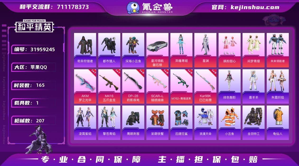 无二次-苹果手Q素材号-5粉装-7特效枪-1载具-3粉色飞行器-67722热力值-16王牌印记-165套装-207枪皮 【热门品类】:套装-浪漫天命,套装-都市猎人,套装-深海小丑鱼,套装-小丑鱼,套装-奇异狩猎者,套装-金羽特工,套装-龟仙人,套装-暗影哥特,角色-Mark.06 【粉色套装】:粉装-飒粉甜心,粉装-闲梦青缨,粉装-未来领航者,角色-星渊,角色-异瞳寒姬 【粉色枪皮等级】:AKM-梦之光华(七级),SCAR-L-锦绣绵绵(五级),M416-五爪金龙(七级),M762-青锋波束(五级),AKS-74U-森灵之息(五级),Kar98K-巳巳如意(五级),DP-28-豹影疾电(五级) 【粉色载具】:星河领航(磐石银) 【粉色枪皮】:AKM-梦之光华,SCAR-L-锦绣绵绵,M416-五爪金龙,M762-青锋波束,AKS-74U-森灵之息,Kar98K-巳巳如意,DP-28-豹影疾电 【粉色飞行器】:炫彩糖果飞行器,齐天大圣飞行器,英伦信使飞行器 【粉色降落伞】:绝对恒星降落伞,春暖花开降落伞,星之彼岸降落伞,洛神天依降落伞,旋转彩虹降落伞,圣堂之誓降落伞,创世·救赎降落伞,星梦奇缘降落伞,金丰海韵降落伞,BEARBRICK降落伞,未来领航者降落伞,千金淑猫降落伞,喜羊羊与灰太狼降落伞,异瞳寒姬降落伞,极意拳锋降落伞,炫彩糖果降落伞,罪夜之冕降落伞 【稀有套装】:套装-龟仙人,套装-雪国风尚,套装-炫彩糖果,套装-雏菊兔兔,套装-萝兰蝴蝶,套装-小熊娃娃,角色-米开朗基罗,角色-狂花道·雅典娜,套装-火种守卫者,套装-糖糖葫芦,套装-青团波波,套装-棉花软糖,角色-都市丽猫,套装-朱霞炽焰,套装-凌霄紫焰,套装-擎苍青焰,玩偶服-喜羊羊,角色-绯色魅影,角色-霜刃之御 【稀有枪皮】:AUG-冰晶雪宝,AKM-2P战斗服款,AKM-奇异狩猎者,AKM-彩虹符号,AKM-影袭,AKM-缤纷海域,AKM-虎虎生威,AKM-龙的传人,M16A4-幻世战舞者,M16A4-甜心亚梦,SCAR-L-夜灯,SCAR-L-...