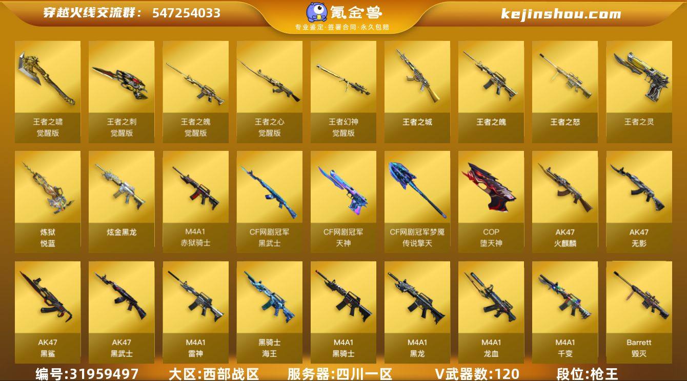 四川一区-122V-19王者-1炫金 【热门武器】:QBZ03-金色蔷薇,Scar Light-白虎,HK417-朱雀,死亡之眼*4,M4A1-黑骑士*3,汤姆逊-烈龙*7,RPK-盘龙*6,加特林-炼狱,斯泰尔-蝴蝶,COP-白鲨,USP-雷暴,COP-堕天神,沙鹰-修罗 【王者炫金武器】:王者之城,王者之魄*3,王者之怒*2,炼狱-悦蓝*2,王者之灵*2,炫金黑龙,王者之魄高爆手雷,王者之魄闪光弹 【音效卡】:Barrett-毁灭音效卡 【皮肤】:裁决-胜者为王 皮肤,雷神-暗月,雷神-冠军之魄,雷神-传奇N9,毁灭耀金皮肤,毁灭-CFS2020,毁灭-英雄计划 皮肤,黑龙-能量核心,黑骑士耀金皮肤,HK417-朱雀-武当,战神-粉色甜心皮肤*9,战神-紫绶金章皮肤*13,战神-流金岁月皮肤*4,屠龙-荣耀之锋,龙啸-青青莓果 皮肤 【角色】:战地猎狐,王者-葵-貂蝉,乔伊教练,修道士,云海玲珑,暗夜-X,芳心审判者,嘉年华灵狐,娟娟,灵狐者-黄金海岸,潘多拉-X,潘多拉-甜心教官,蛇姬,夜玫瑰-幻能朋克,影武者-X,职业选手 【人偶武器】:COP-白鲨,斯泰尔-蝴蝶,AWM-灵狐-15周年嘉年华,迷你生化手雷,闪光弹-小乔 【暴走生化】:死亡之眼*4 【挑战大师】:神圣爆裂者III 【英雄级武器】:M4A1-千变,AK47-火麒麟,M4A1-黑龙,M4A1-雷神*3,M4A1-黑骑士*3,AK47-无影,AK47-黑武士,AK12-天启*3,AK47-黑鲨*3,M4A1-龙血*2,HK417-朱雀,Scar Light-白虎,QBZ03-金色蔷薇,王者之心-觉醒版,王者之魄-觉醒版,AK-47-猩红传说*6,AK47-B-战神,黑骑士-海王,黑武士-CF网剧冠军*2,AWM-天龙,Barrett-毁灭,AWM-裁决*2,王者幻神-觉醒版,RPK-盘龙*6,加特林-炼狱,汤姆逊-烈龙*7,AA-12-雷霆,沙鹰-修罗,沙鹰-天神*3,USP-雷暴,COP-堕天神,柯尔特-电竞装甲,柯尔特-竞技荣光*2,天神-CF网剧冠军*2,屠龙,马来剑-夜魔,擎天,幻灵之锋,擎天-竞技荣光,斩神刀-雷暴...
