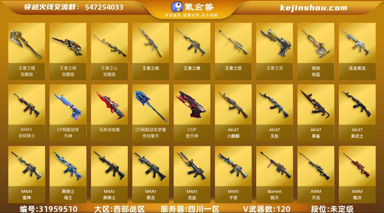 四川一区-122V-19王者-1炫金 【热门武器】:QBZ03-金色蔷薇,Scar Light-白虎,HK417-朱雀,死亡之眼*4,M4A1-黑骑士*3,汤姆逊-烈龙*7,RPK-盘龙*6,加特林-炼狱,斯泰尔-蝴蝶,COP-白鲨,USP-雷暴,COP-堕天神,沙鹰-修罗 【王者炫金武器】:王者之城,王者之魄*3,王者之怒*2,炼狱-悦蓝*2,王者之灵*2,炫金黑龙,王者之魄高爆手雷,王者之魄闪光弹 【音效卡】:Barrett-毁灭音效卡 【皮肤】:裁决-胜者为王 皮肤,雷神-暗月,雷神-冠军之魄,雷神-传奇N9,毁灭耀金皮肤,毁灭-CFS2020,毁灭-英雄计划 皮肤,黑龙-能量核心,黑骑士耀金皮肤,HK417-朱雀-武当,战神-粉色甜心皮肤*9,战神-紫绶金章皮肤*13,战神-流金岁月皮肤*4,屠龙-荣耀之锋,龙啸-青青莓果 皮肤 【角色】:战地猎狐,王者-葵-貂蝉,乔伊教练,修道士,云海玲珑,暗夜-X,芳心审判者,嘉年华灵狐,娟娟,灵狐者-黄金海岸,潘多拉-X,潘多拉-甜心教官,蛇姬,夜玫瑰-幻能朋克,影武者-X,职业选手 【人偶武器】:COP-白鲨,斯泰尔-蝴蝶,AWM-灵狐-15周年嘉年华,迷你生化手雷,闪光弹-小乔 【暴走生化】:死亡之眼*4 【挑战大师】:神圣爆裂者III 【英雄级武器】:M4A1-千变,AK47-火麒麟,M4A1-黑龙,M4A1-雷神*3,M4A1-黑骑士*3,AK47-无影,AK47-黑武士,AK12-天启*3,AK47-黑鲨*3,M4A1-龙血*2,HK417-朱雀,Scar Light-白虎,QBZ03-金色蔷薇,王者之心-觉醒版,王者之魄-觉醒版,AK-47-猩红传说*6,AK47-B-战神,黑骑士-海王,黑武士-CF网剧冠军*2,AWM-天龙,Barrett-毁灭,AWM-裁决*2,王者幻神-觉醒版,RPK-盘龙*6,加特林-炼狱,汤姆逊-烈龙*7,AA-12-雷霆,沙鹰-修罗,沙鹰-天神*3,USP-雷暴,COP-堕天神,柯尔特-电竞装甲,柯尔特-竞技荣光*2,天神-CF网剧冠军*2,屠龙,马来剑-夜魔,
