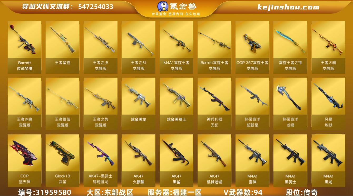 福建一区-114V-18王者武器数-2炫金武器数 【传说武器】:传说梦魇 【传说角色】:传说影煞 【热门武器】:传说梦魇,QBZ03-金色蔷薇,HK417-朱雀*2,M200-竞技荣光,金色小号,Cat-刀锋,牛牛-AK47,M4A1-黑骑士*3,汤姆逊-烈龙*4,RPK-盘龙*4,加特林-炼狱*3,羊驼玩偶*3,毁灭-孙三炮,裁决-雪莉杨,COP-堕天神,沙鹰-修罗,炽芒蝶刃,荣耀世冠-龙啸,金刚伞 【王者炫金武器】:王者星霆,炫金骑士,炫金黑龙 【音效卡】:AK47-火麒麟音效卡,M4A1-雷神音效卡,M4A1-黑龙音效卡,M4A1-黑骑士音效卡,AWM-裁决音效卡 【皮肤】:金色蔷薇-热带奇洋 皮肤,裁决-胜者为王 皮肤,裁决-星际旅行 皮肤,雷神-荣耀之魄,雷神-荣耀世冠AG,火麒麟-华夏之心,AK47-火麒麟-传奇EVEN,火麒麟-平天大圣,火麒麟-白虎,火麒麟-荣耀世冠AG,火麒麟-心动糖果,毁灭耀金皮肤,毁灭-黑大圣皮肤,毁灭-风暴,毁灭-英雄计划 皮肤,M4A1-千变-孔明皮肤,黑龙-墨子皮肤,黑骑士耀金皮肤,黑骑士-伏羲,战神-紫绶金章皮肤*2,战神-流金岁月皮肤*2,AK47-B-常胜将军-曹操,修罗-星空*2,屠龙-荣耀之锋,屠龙-荣耀世冠AG,屠龙-星火燎原,麒麟刺-甜蜜糖果 皮肤 【角色】:炫,春,雨棠,电竞教官-云悠悠,月兔特工,王者樱-热浪之夏,王者葵-惊若翩鸿,王者凌霄,王者-迷迭香,奇洋探员,修道士,炽天使,暗夜-X,飞虎队-X,风暴女,嘉年华灵狐,娟娟,葵-赛博朋克,零-热舞青春,灵动武士,灵狐-花神,灵狐者-X,女战神,潘多拉-甜心教官,赛斯-X,斯沃特-X,铁骑荣耀,雪莉杨,樱-青春偶像,幽 【人偶武器】:毁灭-孙三炮,裁决-雪莉杨,迷你宝贝,AWM-灵狐-15周年嘉年华,COP-旗袍,Cat-刀锋,牛牛-AK47,迷你生化手雷*2,生化手雷-机甲核心,迷你超能女侍 【暴走生化】:超级对讲机 【挑战大师】:激光毁灭者III-白马银枪*2,机甲撕裂...