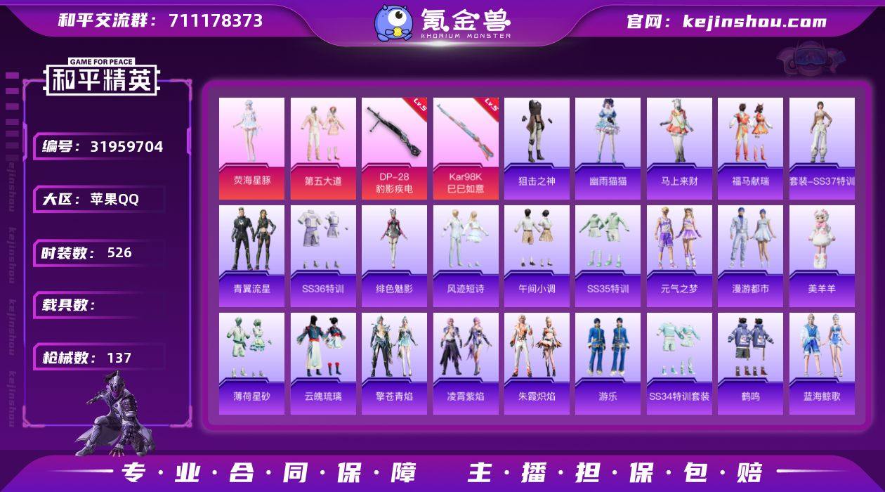 实名:可二次实名 是否支持人脸包赔:支持 粉装数量:2 特效枪数量:2 时装数:526 枪械数:137 第五大道,荧海星豚 五级DP-28-豹影疾电,五级Kar98K-巳巳如意 狙击之神,马上来财,幽雨猫猫,福马献瑞,SS37特训,青翼流星,SS36特训,绯色魅影,风迹短诗,SS35特训,午间小调,元气之梦,漫游都市,美羊羊,薄荷星砂,云魄琉璃,凌霄紫焰,擎苍青焰,SS34特训套装,游乐,朱霞炽焰,冰川格斗者,冰川特警,缤纷果语,冰公主,滨海厨神,白糯汤圆,白色伏地魔,白熊同盟,彩虹兔,长空猛禽,潮流炫酷,都市魅力,都市漫游者,淡雅花蕊,绯格组合,粉红小猪,飞行日记,龟仙人,光之冒险,海岛探路者,鹤鸣,虎虎生威吉莉,湖蓝色名流,海琴烟,黑色伏地魔,黄色伏地魔,黄色名流,黄色运动,红色运动,幻世战舞者,幻羽潜行,幻影武者,酒红色名流,橘黑制服,竞技达人朋克,竞技名士,吉莉礼服,极速红龙,街头潮人,绛羽幽主,空投萌叽,蓝彩潮人,蓝海鲸歌,猎鹰,玲珑飞花,黎明保卫者,浪漫天命,蓝色守护者,蓝色运动,冷焰舞者,猛禽,魅力单车,麻辣教官,懵萌河马,卖崽青蛙,怒火燎原,柠萌假日,牛气满满,破蛋小黄鸡,破晓战魂,绮丽涂鸦,青年教官,青玉碎影,云朵鹅,瑞龙福将,热情海星,人气偶像,深蓝色名流,神气柴柴,SS17特训,SS18特训,SS19特训,SS20特训,SS21特训,SS22特训,SS23特训,SS24特训,SS25特训,SS27特训,SS28特训,SS29特训,SS30特训套装,SS31特训套装,SS33特训套装,巳巳如意,探宝勇士,甜蜜菠萝,甜蜜告白,特殊使命,涂山之恋,特训学院,团圆交子,特战装甲,完美偶像,王牌教练,炫蓝之夏,雪绒豹,旭日情侣,夏日倾情,夏日音浪,星途旅人,香榭午后,耀粉歌者,荧惑魅影,玉兔迎春,野性战心,焰鹰斗篷,耀眼新星,战地督导,灼焰舞者 炫彩糖果飞行器,春暖花开飞行器,绝对恒星降落伞,喜羊羊与灰太狼降落伞,白勺歌姬降落伞,春暖花开降落伞,歌者泠鸢降落伞,精灵梦叶罗丽降落伞,冷漠罗丽降落伞,飒粉甜心降落伞,星夜魔法师降落伞,仲夏莫吉托降落伞 卖家说:号上有点的都有热门的套装都有的
