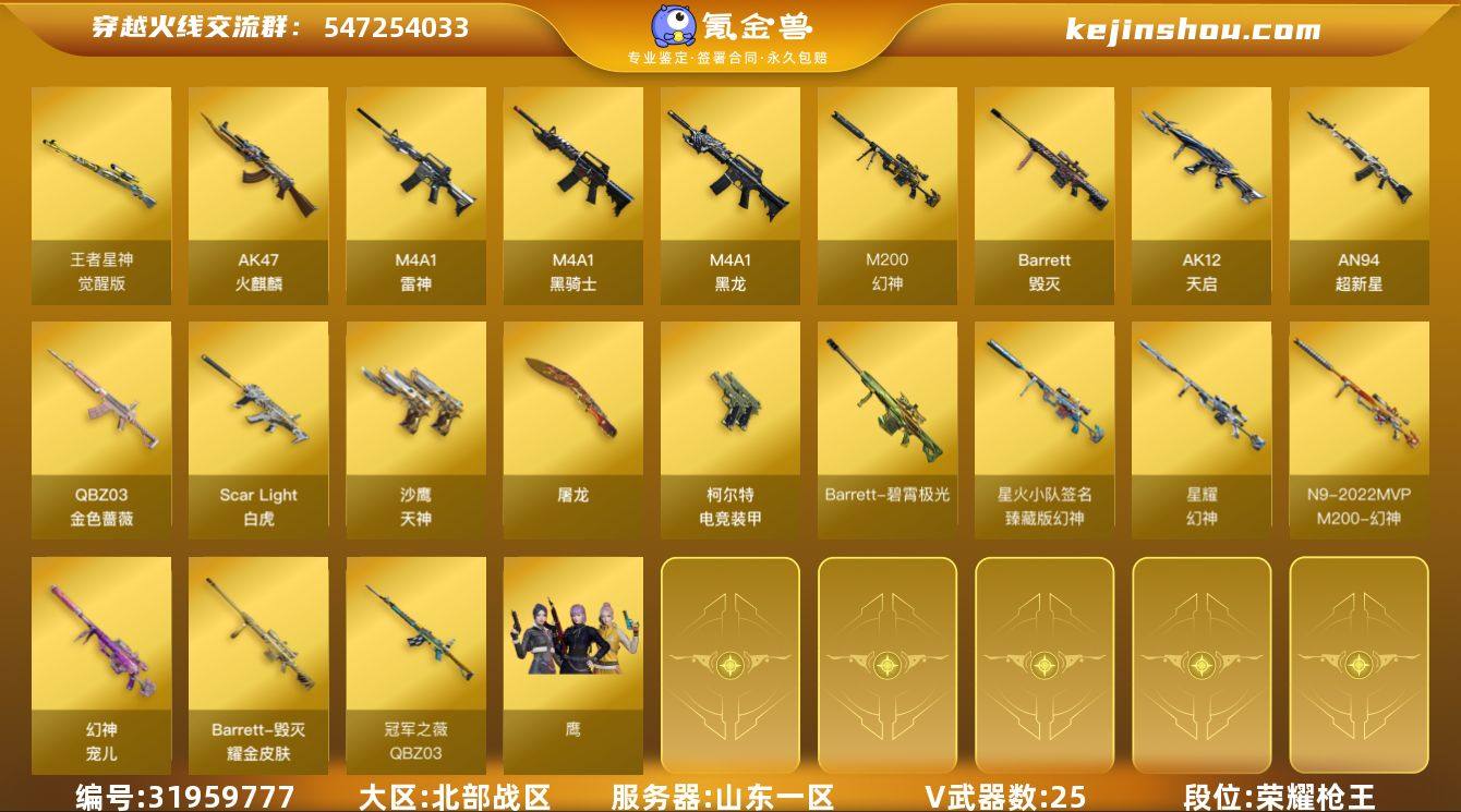 【ky5880】山东一区-27V-1王者武器数-0炫金武器数 【热门武器】:QBZ03-金色蔷薇,Scar Light-白虎,M200-幻神,M4A1-黑骑士 【音效卡】:M4A1-黑骑士音效卡,Barrett-碧霄极光音效卡*2 【皮肤】:幻神-宠儿-2021MVP,M200-幻神-N9-2022MVP,幻神-星耀 皮肤,幻神-星火小队签名臻藏版 皮肤,QBZ03-冠军之薇,雷神-荣耀之魄,毁灭耀金皮肤,屠龙-惊鸿 皮肤 【角色】:鹰,暗夜-X,初恋灵狐,芳心审判者,风暴女,荆棘玫瑰,娟娟,灵狐者-X,曼陀罗-X,蛇姬,铁骑荣耀 【人偶武器】:M4A1-雷神-精英刀锋,生化手雷-机甲核心 【暴走生化】:超级对讲机 【英雄级武器】:AK47-火麒麟,M4A1-黑龙,M4A1-雷神,M4A1-黑骑士,AK12-天启,AN94-超新星,Scar Light-白虎,QBZ03-金色蔷薇,Barrett-毁灭,M200-幻神,王者星神-觉醒版,沙鹰-天神,柯尔特-电竞装甲,屠龙,高爆手雷-竞技荣光*3,闪光弹-雷霆,闪光弹-竞技荣光*2,烟雾弹-古蛇迷踪,Barrett-碧霄极光 【道具】:BS战队炫彩背包,CFS限定背包,EP战队炫彩背包,亚洲杯纪念炫彩背包,炫彩背包-诺拉,虎牙炫彩背包,迷你冰龙背包,哔哩哔哩名片,女皇终结者-魔龙之吻,救世主-黑桃战神,黄金生化钩,绿色巨人,灵魂忍者*2,变异宝贝,迷雾幽灵*2,夺命之镰,防化服*3,流光-鎏金之域,流光-再燃火线,枪王排位28赛季金色流光,枪王排位29赛季金色流光,循环实验表情,EP战队名片,EP战队喷图,防弹头盔*3,防弹衣*3,C4工具钳*3,手雷包*3 【特殊枪械】:1白虎,1黑骑士