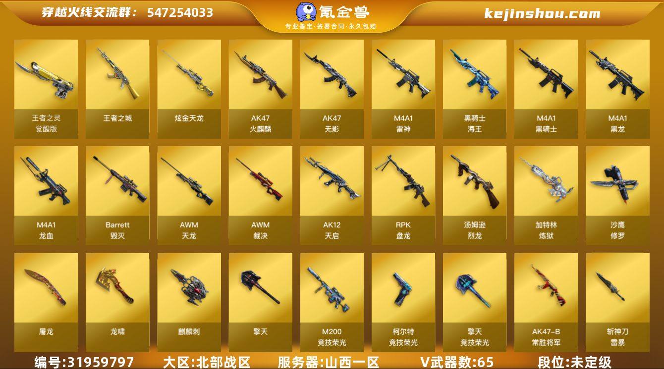 山西一区-67V-6王者-1炫金 【热门武器】:M200-竞技荣光,M4A1-黑骑士,汤姆逊-烈龙*5,RPK-盘龙*4,加特林-炼狱,斯泰尔-蝴蝶,裁决-雪莉杨,沙鹰-修罗 【王者炫金武器】:王者之城,炫金天龙 【音效卡】:AK47-火麒麟音效卡,M4A1-雷神音效卡,M4A1-黑龙音效卡,M4A1-黑骑士音效卡*2,Barrett-毁灭音效卡 【皮肤】:幻神-电竞之星 皮肤,雷神-机甲刑天皮肤,雷神-宇航兔皮肤,雷神-源计划2.0专属 皮肤,火麒麟-AG战队皮肤,火麒麟-雷神,火麒麟-百城,毁灭-冠军之怒,毁灭-黑大圣皮肤,毁灭-神秘黑洞皮肤,黑龙-暗月,黑骑士-暗月,黑骑士-伏羲,战神-粉色甜心皮肤,战神-紫绶金章皮肤,战神-流金岁月皮肤,AK47-B-常胜将军-曹操,炼狱-玩具枪皮肤 【角色】:电竞教官-云悠悠,修道士,空,暗夜-X,初恋灵狐,芳心审判者,风暴女*2,虎妞,嘉年华灵狐,灵狐者-七夕宝贝,龙儿,龙儿-小淘气,曼陀罗-礼服,潘多拉-X,潘多拉-甜心教官,潜龙队-X,邱刚敖,蜀雪,新娜塔莎,雪莉杨,夜玫瑰-幻能朋克,樱-战斗天使,影武者-X 【人偶武器】:裁决-雪莉杨,天龙-曼陀罗,斯泰尔-蝴蝶,巴雷特-零-水下丽影,AWM-灵狐-15周年嘉年华,M37-葵,迷你牛魔王,夺魂,迷你生化手雷,闪光弹-小乔*2,迷你艾比,灵狐娃娃手雷 【挑战大师】:神圣爆裂者III,冰龙粉碎者-白马银枪,激光毁灭者III-白马银枪,激光毁灭者III,试炼破坏者III,KAC-圣炎切割者III,神圣爆裂者-末日III*2,阐释者III 【英雄级武器】:AK47-火麒麟,M4A1-黑龙,M4A1-雷神,M4A1-黑骑士,AK47-无影,AK12-天启,M4A1-龙血,王者之魄-觉醒版,王者之幻-觉醒版,AK-47-猩红传说*2,AK47-B-战神,黑骑士-海王*2,AK47-B-常胜将军,AWM-天龙*2,Barrett-毁灭,AWM-裁决*2,M200-竞技荣光,王者之怒-觉醒版,RPK-盘龙*4,加特林-炼狱,汤姆逊-烈龙*5,沙鹰-修罗...