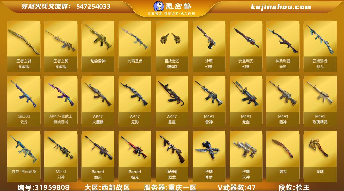 重庆一区-53V-3王者-1炫金 【传说角色】:传说影煞 【热门武器】:M200-幻神,白虎-电玩蓝兔,Cat-刀锋,汤姆逊-烈龙,沙鹰-修罗,高爆手雷-幻兽 【王者炫金武器】:炫金雷神 【音效卡】:M4A1-雷神音效卡 【皮肤】:幻神-荣耀世冠EP 皮肤,金色蔷薇-电竞之星 皮肤,星神-CFS2025 皮肤,M4A1-战神赵云,雷神-源计划2.0专属 皮肤,火麒麟-轻羽皮肤,黑龙-能量核心,轻型军用手斧-再燃火线 【角色】:葵,晴雅,机械姬,妮妮,奇洋探员,空,暗夜-X,电竞少女,飞虎队-X,风暴女,嘉年华灵狐,猎狐者-追月,灵狐者-X,龙儿,麻雀,曼陀罗-X,潘多拉-甜心教官,潜龙队-X,青霞仙子,斯沃特-X,樱-战斗天使,影武者-X,游珑儿 【人偶武器】:火麒麟-灵狐,AWM-灵狐-15周年嘉年华,Cat-刀锋,迷你牛牛,迷你火种,QBZ03-斯沃特 【暴走生化】:超级对讲机 【挑战大师】:冰龙粉碎者-白马银枪,激光毁灭者III,神圣爆裂者-末日III 【英雄级武器】:AK47-火麒麟,M4A1-雷神,AK47-无影,AK47-黑鲨,M4A1-龙血,QBZ03-天罚,无影-神兵利器,QBZ03-云龙,黑武士-锦绣游龙,九霄圣角,M4A1-玫瑰精灵,M4A1-猎神,王者之势-觉醒版,AK47-B-战神,白虎-电玩蓝兔,Barrett-毁灭,Barrett-极光,M200-幻神,Barrett-金色蔷薇,汤姆逊-烈龙,烈龙-云海游龙,沙鹰-修罗,沙鹰-天神*2,沙鹰-幻兽,屠龙,龙啸*2,麒麟刺,斩神刀-雷暴,女皇利刃-幻兽,麒麟刺-百战金芒,王者之锋-觉醒版,高爆手雷-幻兽,高爆手雷-雷暴,高爆手雷-云龙*2,手雷-热带奇洋,闪光弹-幻兽,闪光弹-雷暴,闪光弹-云龙*2,烟雾弹-幻兽,烟雾弹-雷暴,烟雾弹-云龙*2,烟雾弹-荣耀世冠EP 【道具】:CFS限定背包,全能枪王背包,奇洋探员-海龟背包,战舰背包,虎牙炫彩背包,黄金曼提柯尔的背包,女皇终结者-魔龙之吻,救世主-黑桃战神,绿色巨人,灵魂忍者*2...