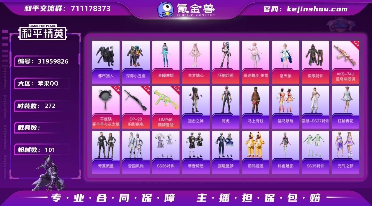 实名:可二次实名 是否支持人脸包赔:支持 粉装数量:6 特效枪数量:4 时装数:272 枪械数:101 都市猎人,深海小丑鱼 异瞳寒姬,羊梦糖心,极限特训,狂魅哈莉,洛天依,奇迹舞步-美雪 七级AKS-74U-星穹咏叹调,六级平底锅-喜羊羊与灰太狼,五级DP-28-豹影疾电,二级UMP45-萌骑冒险 狙击之神,阿虎,马上有钱,福马献瑞,红釉青花,SS37特训,雨过天青,青翼流星,雪国风尚,画境星梦,琴音绮想,SS36特训,绯色魅影,萌鸡速递,SS35特训,元气之梦,申公豹,漫游都市,懒羊羊,美羊羊,喜羊羊,薄荷星砂,凌霄紫焰,擎苍青焰,SS34特训套装,游乐,朱霞炽焰,暗影哥特,冰冻风暴,滨海厨神,彩虹兔,长空猛禽,潮流炫酷,顶瓜瓜,大橘大利,都市猎人,电音精灵,疯狂小兔子,粉恋花,诡诞巡游,贵族骑装,海岛探路者,黄色运动,红色运动,竞技名士,蓝冰羽,冷酷挑战者,漫步者,魅力单车,云朵鹅,深海小丑鱼,SS33特训套装,水银刺客,天籁歌者,王牌教练,雪绒豹,旭日情侣,星渊小夜曲,星影赞美诗,鹰眼刺客,异域银装,折梦之诗,紫幽梦 提桶跑路飞行器,星之彼岸飞行器,谜鸦审判降落伞,异瞳寒姬降落伞,喜羊羊与灰太狼降落伞,百变魔方降落伞,幻影战神降落伞,极限特训降落伞,灵猫魔法师降落伞,双重狂想降落伞,桃源时光降落伞,星穹咏叹调降落伞,智趣喵喵降落伞