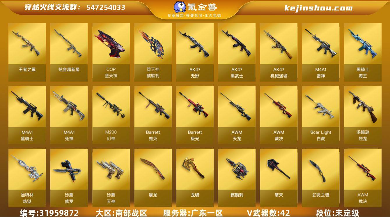 广东一区-48V-4王者武器数-3炫金武器数 【热门武器】:Scar Light-白虎,M200-幻神,死亡之眼*3,M4A1-黑骑士,汤姆逊-烈龙*6,加特林-炼狱,斯泰尔-蝴蝶,COP-堕天神,沙鹰-修罗,金刚伞 【王者炫金武器】:王者之翼,炫金骑士,炫金武士,炫金超新星 【音效卡】:M200-幻神音效卡,Barrett-毁灭音效卡,Barrett-极光音效卡 【皮肤】:幻神-电流骇客 皮肤,裁决-胜者为王 皮肤,火麒麟-平天大圣,毁灭-英雄计划 皮肤,黑龙-暗月,黑骑士耀金皮肤 【角色】:葵,王者涂鸦,云海玲珑,北极狐-X,芳心审判者,风暴女,娟娟,兰-海滩派对,猎狐者-追月,灵狐者-职业经理,曼陀罗-X,潘多拉-X,潘多拉-甜心教官,青霞仙子,铁骑荣耀,维纳斯,雪莉杨,夜玫瑰-宠粉,影武者-X 【人偶武器】:斯泰尔-蝴蝶,迷你牛牛,迷你生化手雷 【暴走生化】:死亡之眼*3 【挑战大师】:激光毁灭者III 【英雄级武器】:M4A1-雷神*2,M4A1-黑骑士,AK47-无影*2,M4A1-死神,AK47-黑武士,AK47-机械迷城,Scar Light-白虎,王者火魄-觉醒版,黑骑士-海王,AWM-天龙,Barrett-毁灭,Barrett-极光,AWM-裁决,M200-幻神,Barrett-金色蔷薇,加特林-炼狱,汤姆逊-烈龙*6,沙鹰-修罗,沙鹰-天神*3,COP-堕天神,COP 357-雷霆王者-觉醒版,屠龙*3,龙啸,麒麟刺-堕天神,擎天,麒麟刺*3,幻灵之锋,王者之锋-觉醒版,高爆手雷-堕天神,闪光弹-堕天神,烟雾弹-堕天神,M4A1-赤狱骑士 【道具】:亚洲杯纪念炫彩背包,战舰背包,炫彩背包,虎牙炫彩背包,救世主-黑桃战神,绿色巨人,灵魂忍者,变异宝贝,妖姬,迷雾幽灵,夺命之镰,防化服*2,枪王排位28赛季金色流光,EP战队名片,防弹头盔*3,防弹衣*3,C4工具钳*3,手雷包*3 【特殊枪械】:蝴蝶斯泰尔+6烈龙,1白虎,1黑骑士,6烈龙,1炼狱,1蝴蝶斯泰尔
