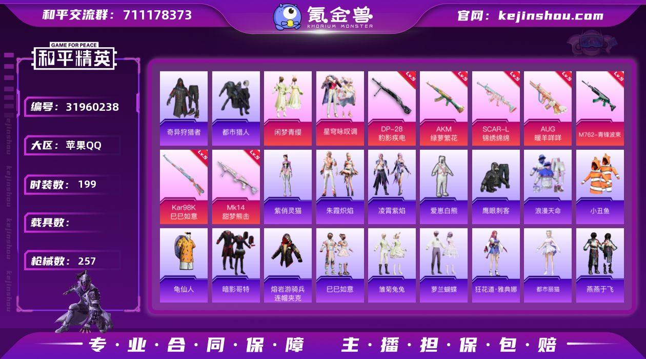 【99】安卓 手Q-8粉装-5特效枪-1载具-2粉色飞行器-59804热力值-5王牌印记-158套装-180枪皮 【热门品类】:套装-小丑鱼,套装-龟仙人,套装-潮萌小黄鸭,套装-粉红小猪 【粉色套装】:粉装-火曜朱雀,粉装-精灵迷巫,粉装-麻辣鲜香锅,粉装-金属狂野,粉装-星穹咏叹调,角色-绯穹魔姬,角色-花灵,角色-冰魄 【粉色枪皮等级】:M762-青锋波束(五级),Vector-绯穹魔姬(六级),Kar98K-巳巳如意(五级),Mini14-龙虾霸霸(七级),DP-28-豹影疾电(五级) 【粉色载具】:玛莎拉蒂Ghibli(粉) 【粉色枪皮】:M762-青锋波束,Vector-绯穹魔姬,Kar98K-巳巳如意,Mini14-龙虾霸霸,DP-28-豹影疾电 【粉色降落伞】:凝视深渊降落伞,至尊龙雀降落伞,梦幻火箭降落伞,星之信仰降落伞,龙虾霸霸降落伞,恐龙拽拽降落伞,蜜语绒猫降落伞,精灵梦叶罗丽降落伞,忍者神龟降落伞,拳皇·狂花道降落伞,动力核心降落伞,彩虹独角兽降落伞,月下星之子降落伞,喜羊羊与灰太狼降落伞,异瞳寒姬降落伞,炫彩糖果降落伞 【稀有套装】:套装-龟仙人,套装-雏菊兔兔,套装-萝兰蝴蝶,套装-小熊娃娃,套装-先驱飞行员,套装-火种守卫者,套装-糖糖葫芦,套装-青团波波,套装-棉花软糖,角色-光矢逐梦,套装-燕燕于飞,套装-鱼渊荷华,套装-紫幽梦,套装-蓝冰羽,套装-星影赞美诗,角色-乐音,套装-朱霞炽焰,套装-凌霄紫焰,套装-擎苍青焰,角色-紫俏灵猫 【稀有枪皮】:AKM-星之信仰,AKM-霓虹街区,M16A4-凝视深渊,M16A4-生命誓言,M16A4-龙虾霸霸,SCAR-L-凝视深渊,SCAR-L-夜灯,SCAR-L-炫彩节奏,M416-仓鼠灰灰,M416-夜灯,GROZA-生命誓言,GROZA-黑色刀锋,AUG-凝视深渊,AUG-天降萌叽,AUG-耀粉歌者,QBZ-彩虹符号,M762-拳皇97,M762-深海曼妙,M762-潮萌小黄鸭,M762-牛气冲天,G36C-星穹咏叹调,AC-VAL-天降萌叽,蜜獾-天降萌叽...