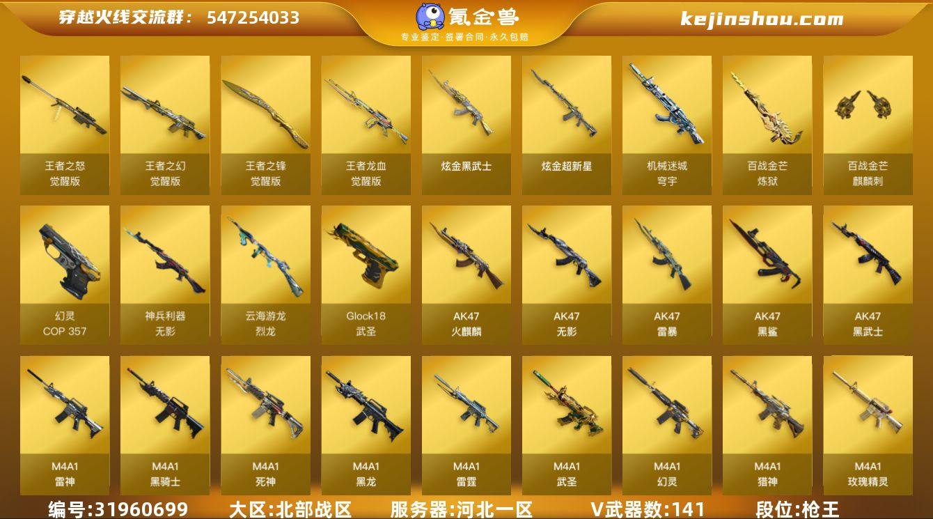 河北一区-157V-4王者武器数-2炫金武器数 【热门武器】:QBZ03-金色蔷薇,M200-幻神,白虎-电玩蓝兔,QBZ03-街机,M4A1-黑骑士,汤姆逊-烈龙*6,加特林-炼狱,斯泰尔-蝴蝶,白虎-枪娘安妮,雷神-小红,USP-雷暴,COP 357-幻灵*2,沙鹰-修罗*3 【王者炫金武器】:炫金武士,炫金超新星 【音效卡】:烈龙-云海游龙音效卡,M200-幻神音效卡,M4A1-黑骑士音效卡,Barrett-毁灭音效卡,Barrett-碧霄极光音效卡,炼狱-百战金芒-庆典舞曲音效卡 【皮肤】:M200-幻神-黄忠皮肤,幻神-冠军之幻,幻神-纸灯龙皮肤,白虎-电玩粉兔皮肤,金色蔷薇-电竞之星 皮肤,AWM-裁决-百城联赛天津皮肤,AWM-裁决-凤灵皮肤,雷神-能量核心*3,雷神-机甲刑天皮肤,雷神-维纳斯皮肤,M4A1-雷神-巅峰荣耀皮肤,M4A1-再燃火线,雷神-神秘按键 皮肤,火麒麟-雷神,火麒麟-平天大圣,火麒麟-百城,火麒麟-心动糖果,毁灭-暗月,毁灭-CFS2020,毁灭-黑大圣皮肤,毁灭-航天科技皮肤,毁灭-虹光风暴 皮肤,毁灭-英雄计划 皮肤,M4A1-千变-孔明皮肤,黑龙-能量核心,黑龙-暗月,黑骑士-暗月,黑骑士-幻能朋克 皮肤,黑骑士-破浪10年皮肤,无影-能量核心,死神-秘银,战神-粉色甜心皮肤,战神-流金岁月皮肤,修罗-能量核心*2,轻型军用手斧-再燃火线,擎天-蒸汽钟表 皮肤,麒麟刺-萌杀皮肤 【角色】:魅影,炫,春,影豹,审判者,零·纪元,战地猎狐,王者-葵-貂蝉,王者-零,王者之瞳,王者玲珑-小乔,乔伊教练,修道士,云海玲珑,葵-阿尔法武装,初恋灵狐,电竞少女,芳心审判者,风暴女*2,虎妞,嘉年华灵狐,娟娟,0号玩家,灵动武士,零-水下丽影,龙儿-小淘气,玫瑰花神,萌儿,女战神,潘多拉-X,潘多拉-甜心教官,潜龙队-X,青霞仙子,蛇姬,斯沃特-X,铁骑荣耀,兔囡囡,维纳斯,新娜塔莎,雪莉杨-摸金校尉,夜玫瑰-幻能朋克,樱-战斗天使,...