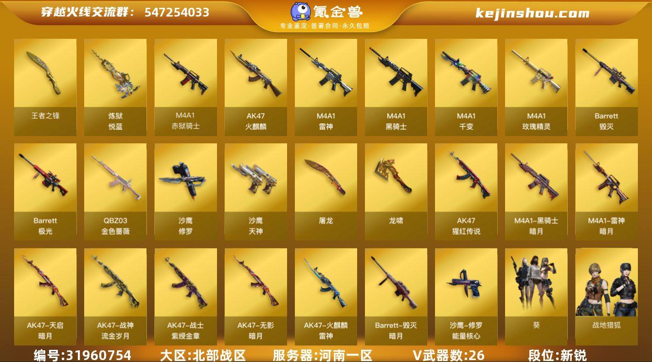 河南一区-29V-2王者武器数-0炫金武器数 【热门武器】:QBZ03-金色蔷薇,死亡之眼*3,M4A1-黑骑士,沙鹰-修罗*2 【王者炫金武器】:炼狱-悦蓝,王者之锋 【皮肤】:雷神-暗月,火麒麟-雷神,毁灭-暗月,毁灭-英雄计划 皮肤,黑骑士-暗月,无影-暗月,天启-暗月,战神-紫绶金章皮肤*2,战神-流金岁月皮肤,修罗-能量核心,天神-暗月 【角色】:葵,战地猎狐,乔伊教练,暗夜-X,北极狐-X,灵狐者-X,灵狐者-黄金海岸,潘多拉-X,蛇姬,影武者-X 【暴走生化】:死亡之眼*3 【英雄级武器】:M4A1-千变,AK47-火麒麟,M4A1-雷神*2,M4A1-黑骑士,M4A1-玫瑰精灵*2,QBZ03-金色蔷薇,AK-47-猩红传说*2,Barrett-毁灭,Barrett-极光,Barrett-金色蔷薇,沙鹰-修罗*2,沙鹰-天神,屠龙*2,龙啸,高爆手雷-雷霆,闪光弹-雷霆,烟雾弹-雷霆,M4A1-赤狱骑士 【道具】:BS战队炫彩背包,战舰背包,炫彩背包-诺拉,炫彩背包,背包-洛丽塔,超级背包,女皇终结者-魔龙之吻,救世主-黑桃战神,绿色巨人,灵魂忍者,迷雾幽灵,夺命之镰,防化服*3,枪王排位29赛季金色流光,防弹头盔*3,防弹衣*4,C4工具钳*3,手雷包*3 【特殊枪械】:1黑骑士