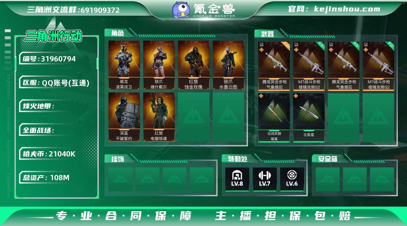 S1287 总资产108M,哈夫币2104w,腾龙火特效,典藏4 近战3 枪皮数量229,威龙-凌霄戍卫/骇爪-维什戴尔/红狼-蚀金玫瑰/骇爪-水墨云图/红狼-电锯惊魂/深蓝-不破誓约,近战-暗星/近战-北极星,腾龙突击步枪-气象感应(极品B)/M7战斗步枪-棱镜攻势S2(优品S)/M7战斗步枪-棱镜攻势S2(优品C)/腾龙突击步枪-气象感应(优品C)战场等级23军士长, 行动等级60铂金,安全箱等时效性道具请以游戏内数据为准,详情请看图