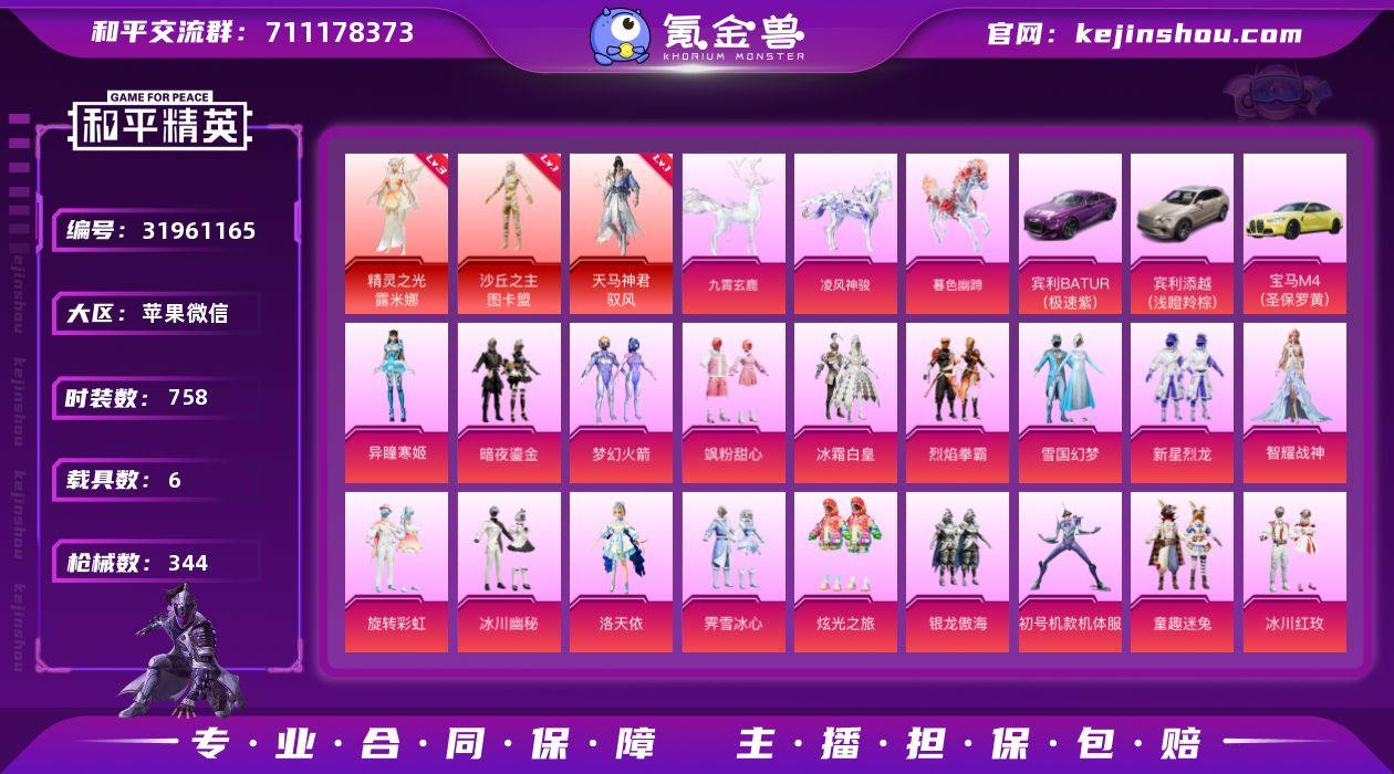 实名:不可二次实名 是否支持人脸包赔:支持 粉装数量:22 特效枪数量:27 载具数:6 时装数:758 枪械数:344 三级精灵之光-露米娜,一级沙丘之主-图卡盟,一级天马神君-驭风 异瞳寒姬,暗夜鎏金,冰川红玫,冰川幽秘,冰霜白皇,初号机款机体服,纯珍童话,骨龙祭渊,霁雪冰心,洛天依,烈焰拳霸,梦幻火箭,飒粉甜心,天使彩虹糖,相思残雪,童趣迷兔,雪国幻梦,炫光之旅,新星烈龙,旋转彩虹,银龙傲海,智耀战神 七级AUG-超新星,七级GROZA-旋转彩虹,七级M416-心之恋语,七级SCAR-L-甜梦小狐,六级MG3-萌骑闯关,六级AKM-星际浪客,五级破片手榴弹-招财进宝,五级AKS-74U-森灵之息,五级DP-28-豹影疾电,五级Kar98K-巳巳如意,四级ACE32-萌骑漫游,四级ARX-萌骑跃动,四级燃烧瓶-天降桃花,四级AWM-焰龙焚天,四级DP-28-暗夜鎏金,四级M16A4-垂柳戏鸭,三级烟雾弹-好运连连,三级AKM-暮色玫影,二级M416-天马神君,二级蜜獾-异瞳寒姬,一级AA12-G-萌骑幻想,一级PKM-萌骑夺宝,一级UMP45-萌骑冒险,一级AMR-智耀战神,一级M416-五爪金龙,一级MG3-洛神天依,一级SCAR-L-纯梦嫁纱 九霄玄鹿,凌风神骏,暮色幽蹄,宾利BATUR(极速紫),宾利添越(浅瞪羚棕),宝马M4(圣保罗黄) 狙击之神,马上有钱,福马献瑞,红釉青花,SS37特训,雨过天青,青翼流星,画境星梦,琴音绮想,SS36特训,炫彩糖果,绯色魅影,萌鸡速递,紫俏灵猫,风迹短诗,SS35特训,午间小调,喜羊羊,薄荷星砂,狂鲨锋刃,凌霄紫焰,SS34特训套装,朱霞炽焰,暗黑裁决,暗影爵士,暗夜傀儡,暴风机械师,北国孤狼,冰公主,滨海厨神,滨海假日,冰河战士,白兰地假日,贝斯之夜,纯白跃动,春光漫游,雏菊兔兔,长空猛禽,潮流游乐家,纯真浪花,达芬奇,顶瓜瓜,蝶变,大橘大利,电音精灵,飞驰魅影,绯格组合,粉红小猪,疯狂小兔子,粉恋花,福星高照,飞行日记,格斗先锋,瑰梦爱神,龟仙人,光之冒险,幻彩翩翩,虎虎生威吉莉,湖蓝色名流,荷畔雨呱,黄色名流,幻世战舞者,和煦暖阳,幻羽潜行,军刀雅典娜,惊鸿侠骨,娇憨猪猪,竞技名士,竞技勇士朋克,吉莉礼服,街头潮人,锦衣飞扬,酷潮明星,空岛之星,科技之星,快闪甜心,空投萌叽,蓝冰羽,蓝彩潮人,龙的传人,灵公主,龙魂突击队,萝兰蝴蝶,猎梦纪元,灵蜜圈圈,浪漫樱花,镭射皇者,蓝色运动,龙腾端午,蓝甜马卡龙,冷焰舞者,妙红点点,梦幻奶油,萌黄之夏,魅力单车,麻辣教官,懵萌河马,曼妙人鱼,梦起落英,萌趣咩咩,蜜桃派对,明鸳圣池,梦之呓语,奶芙汪汪,暖风夏荷,霓虹街区,柠萌假日,牛气冲天,牛气满满,暖心熊熊,破蛋小黄鸡,青春冒险家,轻风白浪,沁蓝冰爽,绮丽涂鸦,青年教官,青涩时光,青团波波,千禧之恋,云朵鹅,瑞龙福将,荣耀,热情海星,热血青春,软羊咩咩,S6赛事,深海来使,深海梦境,时空追击者,神气柴柴,SS10特训,SS11特训,SS12特训,SS13特训,SS14特训,SS15特训,SS16特训,SS17特训,SS18特训,SS19特训,SS20特训,SS21特训,SS22特训,SS23特训,SS24特训,SS25特训,SS26特训,SS27特训,SS28特训,SS29特训,SS30特训套装,SS31特训套装,SS32特训套装,SS33特训套装,SS5特训,SS6特训,SS7特训,SS8特训,SS9特训,酸甜橘柚,探宝勇士,天籁歌者,甜蜜告白,甜蜜熊情侣,甜梦熊熊,涂山之恋,糖糖葫芦,特训学院,甜