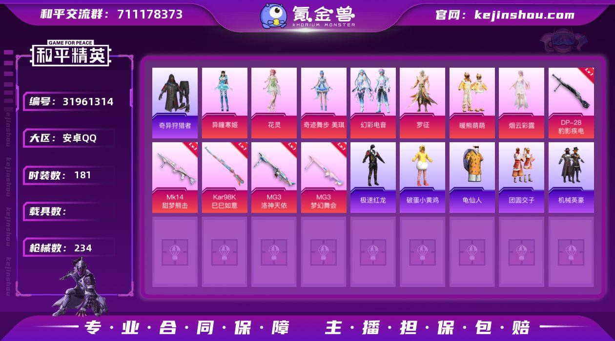 DYH17855【素材号7粉装5特效6飞行器】安卓Q-1稀有7粉装5特效枪7热门181套装234枪皮 72411热力值 14印记 历史超级王牌7星 【1稀有】 奇异狩猎者 【7粉装】 奇迹舞步美琪 花灵 异瞳寒姬 罗征 烟云彩露 幻彩电音 暖熊萌萌 【5特效枪】 Kar98K-巳巳如意 (5级) DP-28-豹影疾电 (5级) Mk14-甜梦熊击 (5级) MG3-梦幻舞会 (7级) MG3-洛神天依 (4级) 【7热门】 龟仙人 团圆交子 机械英豪 破蛋小黄鸡 极速红龙 S686-奇异狩猎者 M24-香水柠檬 【1飞行器】 拂晓神骑飞行器 【1背包】 百万伏特背包 营地ID:710976411
