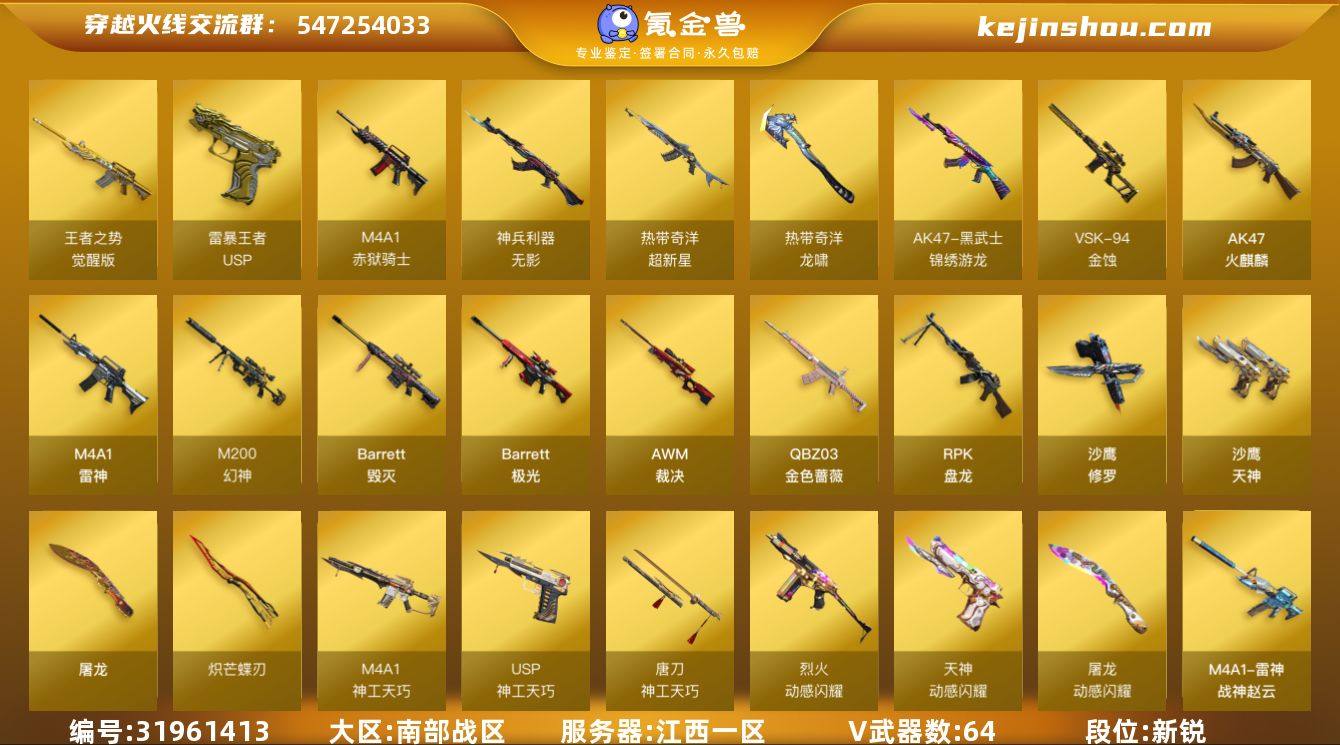 【ky5335】江西一区-66V-6王者武器数-0炫金武器数 【热门武器】:QBZ03-金色蔷薇,M200-幻神,炼狱-迷你小钢,毒蜂,RPK-盘龙*5,沙鹰-修罗*4,炽芒蝶刃 【王者炫金武器】:USP-雷暴王者,王者之魄高爆手雷,王者之魄闪光弹 【音效卡】:烈火-动感闪耀 音效卡,AK47-火麒麟音效卡,M4A1-雷神音效卡,Barrett-毁灭音效卡,Barrett-极光音效卡 【皮肤】:M200-幻神-黄忠皮肤,金色蔷薇-热带奇洋 皮肤,M4A1-战神赵云,雷神-宇航兔皮肤,火麒麟-平天大圣,火麒麟-心动糖果 【角色】:晴雅,奇洋探员,乔伊教练,初恋灵狐,飞虎队-X,风暴女,嘉年华灵狐,猎狐者-追月,灵狐者-黄金海岸,斯沃特-X,兔囡囡,雪莉杨,樱-战斗天使,游珑儿 【人偶武器】:炼狱-迷你小钢,AWM-灵狐-15周年嘉年华*2,迷你牛牛,迷你生化手雷*3,生化手雷-机甲核心,深渊终结者手雷,灵狐娃娃手雷 【暴走生化】:毒蜂,双面神,超级对讲机 【挑战大师】:激光毁灭者III-白马银枪,神圣爆裂者-末日III 【英雄级武器】:AK47-火麒麟,M4A1-雷神,M4A1-神工天巧,无影-神兵利器,黑武士-锦绣游龙,超新星-热带奇洋,QBZ03-金色蔷薇,烈火-动感闪耀,王者之势-觉醒版,白虎之魄-觉醒版,Barrett-毁灭,Barrett-极光,AWM-裁决,M200-幻神,VSK-94-金蚀,RPK-盘龙*5,沙鹰-修罗*4,沙鹰-天神,USP-神工天巧*2,天神-动感闪耀,屠龙*2,炽芒蝶刃,唐刀-神工天巧*4,屠龙-动感闪耀,龙啸-热带奇洋,高爆手雷-神工天巧*7,手雷-动感闪耀,高爆手雷-云龙,手雷-热带奇洋,闪光弹-神工天巧*7,闪光弹-云龙,烟雾弹-神工天巧*7,烟雾弹-云龙,M4A1-赤狱骑士 【道具】:云山科技背包,冰冰企鹅背包,奇洋探员-海龟背包,热带奇洋炫彩背包,超级背包,女皇终结者-魔龙之吻,绿色巨人,灵魂忍者*2,变异宝贝,迷雾幽灵*2,生化弹匣,夺命之镰*2,防化服*3...