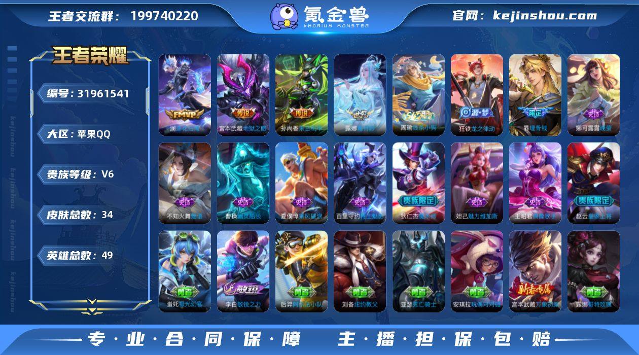 贵族6/皮肤34/传说6/史诗12/英雄49/敖隐全皮/李信问心剑/韩信踏浪归/马超神骥逐星野/澜逐花归海/霜月吟/末日机甲-孙尚香/地狱之眼/埋骨钱/皇家上将/魔术师/海滩派对/线条小狗-周瑜/明世隐百晓客/龙之律动/魅语/晚萤/特工魅影/乘风破浪/幽灵船长/魅力维加斯/偶像歌手/吕布舞狮寰/极光幻客/敏锐之力/纽约教父/阿尔法小队/万象初新/死亡骑士/玩偶对对碰/哥特玫瑰/碧珀绯影/启蛰/灼热之刃