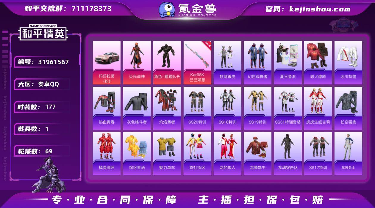 实名: 可修改 时装数: 177 载具数: 1 枪械数: 69 战备数: 55 热门装扮: 软萌银虎,炎氏战神,猩猩队长 载具: 玛莎拉蒂Ghibli(粉) 稀有枪皮: Kar98K-巳巳如意