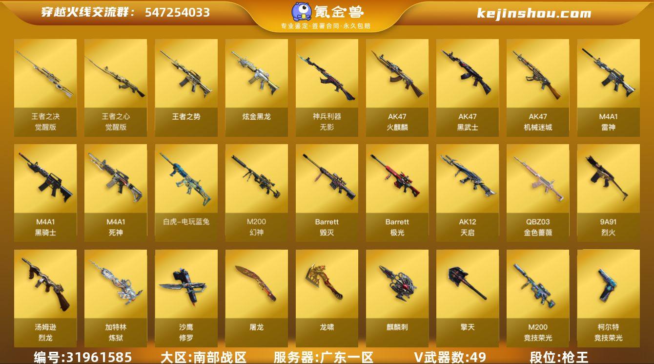 自带包赔 最高三倍】:南部战区-广东一区LV.100-段位-枪王3-49V-4王者武器-1炫金武器 【热门武器】:QBZ03-金色蔷薇,M200-幻神,M200-竞技荣光,死亡之眼*4,白虎-电玩蓝兔,M4A1-黑骑士,汤姆逊-烈龙*2,加特林-炼狱,毁灭-孙三炮,沙鹰-修罗*3 【王者炫金武器】:王者之势,王者凤吟,炫金黑龙 【音效卡】:M200-幻神音效卡,M4A1-黑骑士音效卡,Barrett-毁灭音效卡,QBZ03-金色蔷薇音效卡 【皮肤】:幻神-降龙,雷神-能量核心,M4A1-雷神-CFS 2019,雷神-虎将,火麒麟-平天大圣,火麒麟-巅峰荣耀,黑骑士-伏羲,黑骑士-少林,战神-粉色甜心皮肤*2,AK47-B-常胜将军-刘备,AK47-B-常胜将军-孙权,极光-能量核心,修罗-星空,麒麟刺-甜蜜糖果 皮肤 【角色】:樱,荒漠琉璃,王者涂鸦,空,芳心审判者,风暴女,嘉年华灵狐,兰-新年限定,零-热舞青春,灵动武士,灵狐者-黄金海岸,灵狐者-七夕宝贝,麻雀,潘多拉-X,潘多拉-甜心教官,青霞仙子,甜心偶像,蜀雪,新娜塔莎,樱-缤纷夏日,影武者-X 【人偶武器】:毁灭-孙三炮,天龙-曼陀罗,M4A1-雷神-精英刀锋,AWM-灵狐-15周年嘉年华,黄金迷你深渊冰龙,迷你波特博士*2,夺魂*3,迷你火种,迷你超能女侍 【暴走生化】:死亡之眼*4,超级对讲机 【挑战大师】:神圣爆裂者III,AK47-冰龙粉碎者,冰龙粉碎者-白马银枪,激光毁灭者III-白马银枪,激光毁灭者III,阐释者III 【英雄级武器】:AK47-火麒麟,M4A1-雷神*4,M4A1-黑骑士,M4A1-死神,AK47-黑武士,AK12-天启,AK47-机械迷城,无影-神兵利器,QBZ03-金色蔷薇,9A91-烈火,王者之心-觉醒版,AK47-B-常胜将军,白虎-电玩蓝兔,Barrett-毁灭,Barrett-极光,M200-幻神,M200-竞技荣光,Barrett-金色蔷薇,王者之决-觉醒版,加特林-炼狱,汤姆逊-烈龙*2,沙鹰-修罗*3,柯尔特-竞技荣光,屠龙*3,龙...
