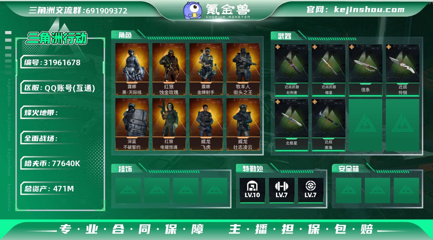 S1300 总资产471M,哈夫币7764w,近战7 枪皮数量389,露娜-黑天际线/红狼-蚀金玫瑰/露娜-金牌射手/红狼-电锯惊魂/深蓝-不破誓约/无名-夜鹰/威龙-壮志凌云/威龙-飞虎/蜂医-送葬人无题密令/牧羊人-街头之王,近战-暗星/近战-处刑者/近战-信条/近战-北极星/近战-黑海/近战-怜悯,战场等级35上等兵, 行动等级60黑鹰,安全箱等时效性道具请以游戏内数据为准,详情请看图