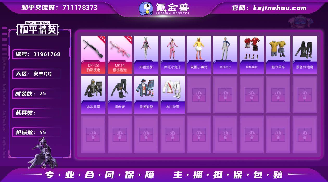 【ky460】安卓 手Q-0粉装-0特效枪-0载具-0粉色飞行器-12015热力值-1王牌印记-39套装-43枪皮 【热门品类】:套装-浪漫天命 【粉色降落伞】:仲夏莫吉托降落伞 【稀有枪皮】:AKM-彩虹符号,AKM-灼热熔岩,SCAR-L-炫彩节奏,SCAR-L-碧影闪光,M416-红色方程式,GROZA-异彩先驱,GROZA-影袭,GROZA-春暖花开,QBZ-飞驰魅影,M762-天降萌叽,Mk47-妙红点点,AC-VAL-天降萌叽,汤姆逊-天降萌叽,汤姆逊-异彩先驱,MP5K-异彩先驱,P90-飞驰魅影,Kar98K-炫彩节奏,Kar98K-飞驰魅影,SKS-炫彩节奏,Mini14-异彩先驱,AMR-妙红点点,S686-生命誓言,S1897-春暖花开,S1897-飞驰魅影,M249-妙红点点,DP-28-彩虹符号,MG3-妙红点点,MG3-幻世战舞者 【其他套装】:套装-SS18特训,套装-SS19特训,套装-SS29特训,套装-冷焰舞者,套装-暗金炫舞,套装-浪漫天命,套装-湖蓝色名流,套装-炫蓝之夏,套装-特训学院,套装-猛禽,套装-疯狂小兔子,套装-白色伏地魔,套装-破蛋小黄鸡,套装-空投萌叽,套装-竞技名士,套装-绮丽涂鸦,套装-缤纷果语,套装-蓝彩潮人,套装-蓝色运动,套装-长空猛禽,套装-青年教官,套装-魅力单车,套装-鹤鸣,套装-黄色伏地魔,套装-水银刺客,套装-异彩先驱,套装-霓虹极客,套装-极乐追光,套装-飞驰魅影,套装-音速流光,套装-浓情蜜辣,套装-妙红点点,套装-幻彩翩翩 【营地ID】:794824551