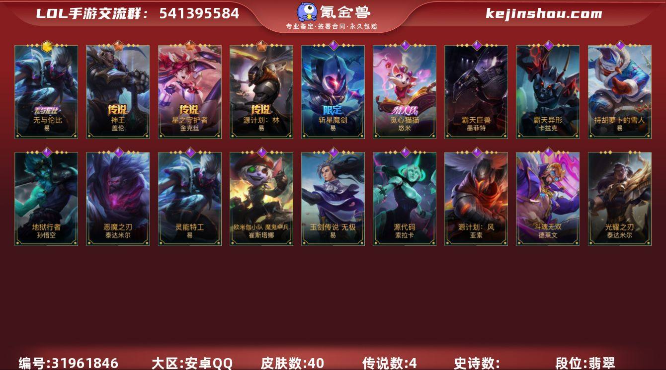 WLSY505【1神话 4传说】安卓Q-英雄38-皮肤40-传说4 段位:翡翠【神话】无与伦比易【传说】源计划:林 易 星之守护者金克丝 神王盖伦 源计划:超体 莫德凯撒【史诗】蕊雪盈春宴安赫卡里姆 霸天巨兽墨菲特 霸天夜翼魔腾 源代码索拉卡 持胡萝卜的雪人易 神龙尊者均衡之龙沃利贝尔 斩星魔剑易 恶魔之刃泰达米尔 源计划:风亚索 欧米伽小队崔丝塔娜 觅心猫猫悠米 地狱行者孙悟空 灵能特工易 暗星墨菲特 玉剑传说无极 斗魂无双德莱文 霸天异形卡兹克【皮肤】无与伦比剑圣 神王盖伦 星之守护者金克丝 源计划:林 觅心猫猫 欧米伽小队 魔鬼伞兵 斩星魔剑 源计划:风 源代码索拉卡 玉剑传说 无极 斗魂无双德莱文 灵能特工剑圣 霸天巨兽石头人 霸天异形螳螂 持胡萝卜的雪人 恶魔之刃 地狱行者猴子 s1光耀之刃