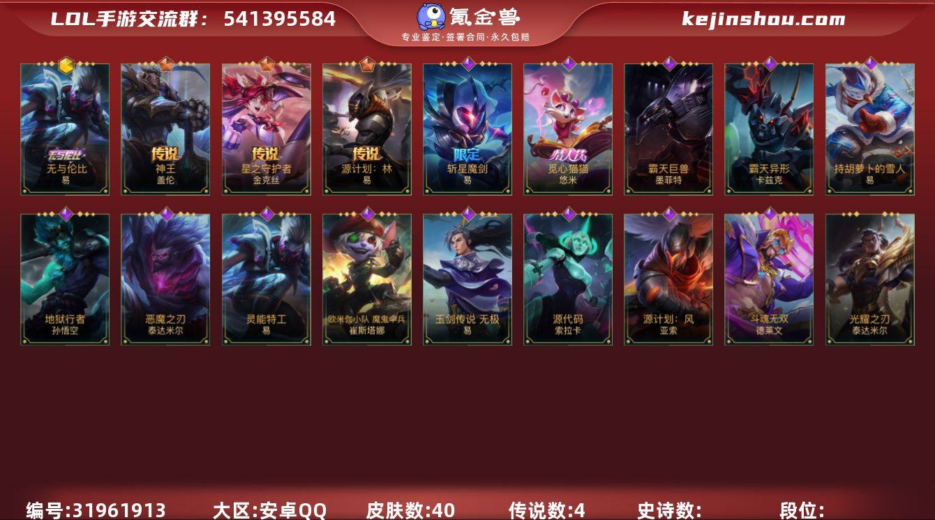 WLSY505【1神话 4传说】安卓Q-英雄38-皮肤40-传说4 段位:翡翠【神话】无与伦比易【传说】源计划:林 易 星之守护者金克丝 神王盖伦 源计划:超体 莫德凯撒【史诗】蕊雪盈春宴安赫卡里姆 霸天巨兽墨菲特 霸天夜翼魔腾 源代码索拉卡 持胡萝卜的雪人易 神龙尊者均衡之龙沃利贝尔 斩星魔剑易 恶魔之刃泰达米尔 源计划:风亚索 欧米伽小队崔丝塔娜 觅心猫猫悠米 地狱行者孙悟空 灵能特工易 暗星墨菲特 玉剑传说无极 斗魂无双德莱文 霸天异形卡兹克【皮肤】无与伦比剑圣 神王盖伦 星之守护者金克丝 源计划:林 觅心猫猫 欧米伽小队 魔鬼伞兵 斩星魔剑 源计划:风 源代码索拉卡 玉剑传说 无极 斗魂无双德莱文 灵能特工剑圣 霸天巨兽石头人 霸天异形螳螂 持胡萝卜的雪人 恶魔之刃 地狱行者猴子 s1光耀之刃