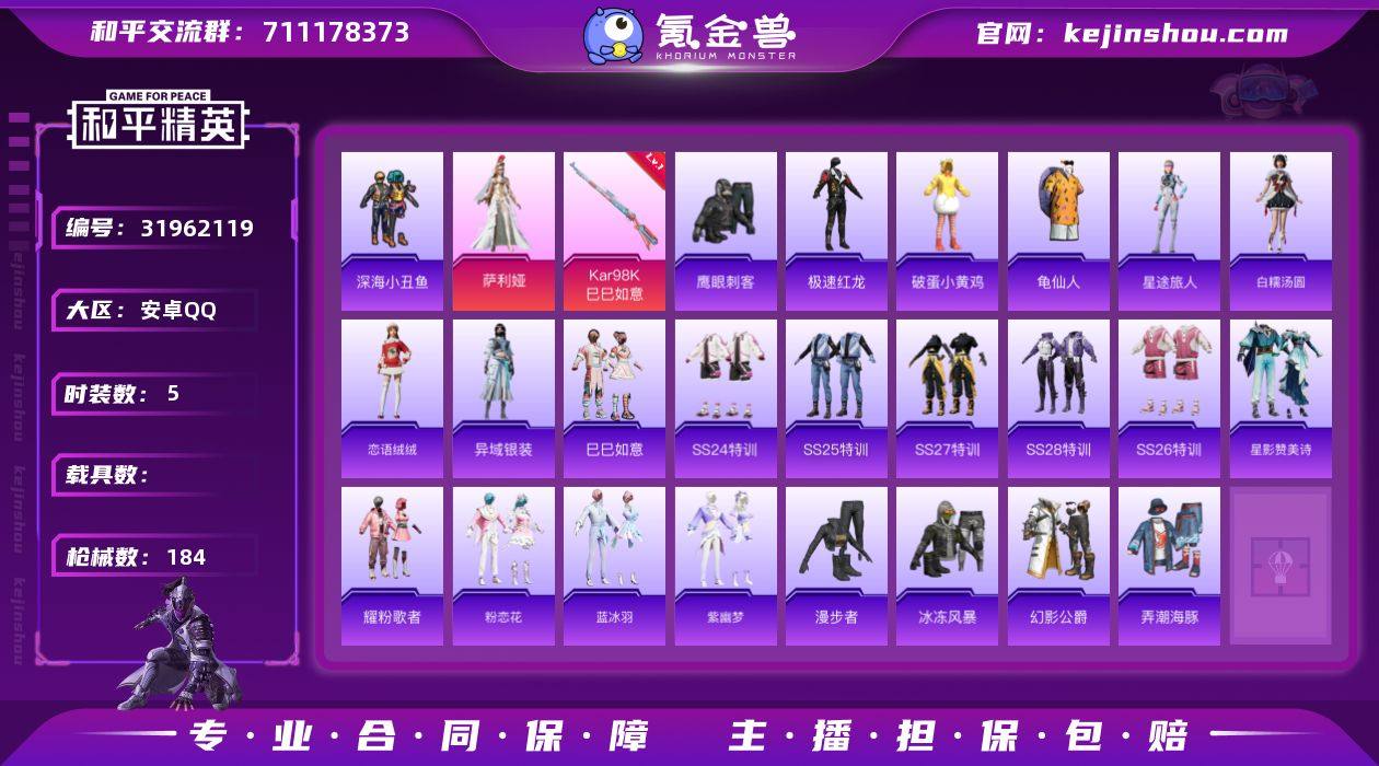WJ813【身法号5粉装-6特效枪 深海小丑鱼 洛天依 地铁满天赋 隔离到3.7号】安卓手Q-5粉装-6特效枪-138套装-184枪皮-10王牌印记-超级王牌2星-51705热力值【5粉装】角色-异瞳寒姬,角色-月中灵,角色-洛天依,角色-萨利娅,角色-花灵【6特效枪】Kar98K-巳巳如意[5级],蜜獾-异瞳寒姬[7级],Mk14-福马献瑞[5级],DP-28-豹影疾电[5级],信号枪-金乌曜日[3级],AA12-G-萌骑幻想[4级]【1稀有】深海小丑鱼【9飞行器】狂鲨锋刃飞行器,异域银装飞行器,顶峰精英尾迹,鸡智如我飞行器,空岛之星尾迹,登顶巅峰飞行器,马上有福飞行器,破刃行动尾迹,炫彩糖果飞行器【1头盔】幻影战神头盔【1背包】幻影战神背包【310其它衣服和枪皮】极速红龙,海盐绵绵冰,萌鸡速递,魅力单车,SS27特训,破晓战魂,元素星魂,SS32特训,恋语绒绒,潮流炫酷,云魄琉璃,空岛之星,秘语星愿,猎鹰,战地督导,星途旅人,福马献瑞,深蓝色名流,王牌教练,顶瓜瓜,白色伏地魔,霓虹街区,竞技名士,绮丽涂鸦,凌霄紫焰,龙魂突击队,角色-紫俏灵猫,SS18特训,SS31特训,雪绒豹,冰河战士,玩偶服-懒羊羊,竞技达人朋克,都市漫游者,雨过天青,游乐,红色运动,蓝冰羽,SS26特训,朱霞炽焰,蓝色运动,元气之梦,超能勇士,角色-俏兔智灵,SS23特训,湖蓝色名流,灼焰舞者,幻影公爵,SS22特训,狙击之神,龙的传人,SS25特训,SS35特训,SS19特训,黄色伏地魔,老实芭蕉,云朵鹅,黑色伏地魔,彩虹兔,完美偶像,猛禽,粉恋花,缤纷果语,漫步者,耀粉歌者,龟仙人,红釉青花,长空猛禽,海岛探路者,幻影武者,龙腾端午,战术大师,SS33特训,特训学院,SS29特训,蝶变,白糯汤圆,蓝彩潮人,玲珑侠影,光之冒险,巳巳如意,街头潮人,都市魅力,SS24特训,薄荷星砂,滨海厨神,麻辣教官,角色-光矢逐梦,紫幽梦,旭日情侣,幻世保卫者,酒红色名流,大橘大利,黄色运动,玩偶服-喜羊羊,鹰眼刺客,SS21特训,书海巡游,雪国风尚,SS36特训,冰冻风暴,琴音绮想,角