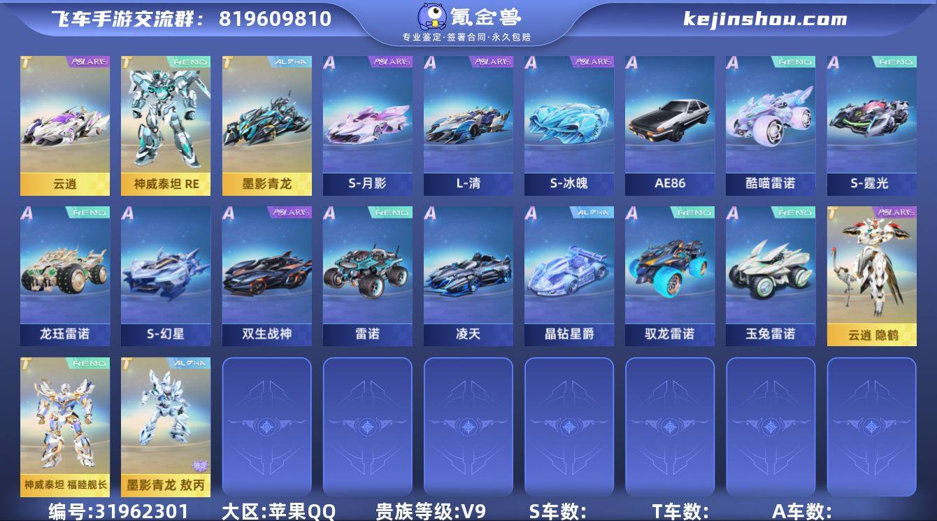 B652934 【5T-5强联赛-幻生套装-魔法套装-骑宠-永久T车-神威泰坦(福睦舰长),墨影青龙(敖丙),云逍(隐鹤),鸭宝超人,蓝波豚宝/5强联赛-S幻星,S-冰魄,S月影,弦音,S霆光/骑宠-瑞泽祥麟/幻生套装-奇喵秘语女装/魔法套装-清梦缱绻女装/男女多套装服饰/多座椅/多名片夹】 A车数量139 游戏等级95 车皮肤数量60 T车数量5 【否】 【可二次实名】 【永久包赔】 【苹果QQ】 稀有车型2 稀有永久A车8 T车皮肤3 魔法时装1 永久T车4 宠物14 稀有车型:双生战神,墨影青龙; 稀有永久A车:驭龙雷诺,玉兔雷诺,L-清,酷喵雷诺,龙珏雷诺,幻星,月影,弦音; T车皮肤:墨影青龙敖丙,神威泰坦福睦舰长,云逍隐鹤; 魔法时装:皓月霜华; 永久T车:墨影青龙,云逍,鸭宝超人,神威泰坦RE; 宠物:极地龙龟,无常小黑,雪域狮王,避水金晶兽,女娲,蔷薇公主,源梦之星,雀焰女王,玉玺神虎,瑞泽祥麟,小悟空,铠甲战士,水鲸游灵,玄火之神;
