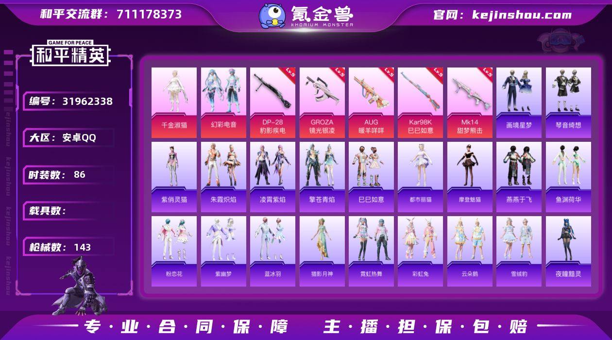 安卓手Q S2-AWF088【2粉装9特效枪1粉色飞行器 千金淑猫/幻彩电音/马上来财/都市丽猫/摩登魅猫/猎影月神/夜瞳黯灵/紫俏灵猫/漫步者】36279热力值-7王牌印记-86套装-143枪皮 【粉色套装】:角色-千金淑猫,粉装-幻彩电音 【粉色枪皮等级】:GROZA-镜光银凌(五级),AUG-暖羊咩咩(五级),UMP45-萌骑冒险(四级),AKS-74U-森灵之息(五级),Kar98K-巳巳如意(五级),Mk14-甜梦熊击(五级),Mk14-福马献瑞(五级),DP-28-豹影疾电(五级),信号枪-金